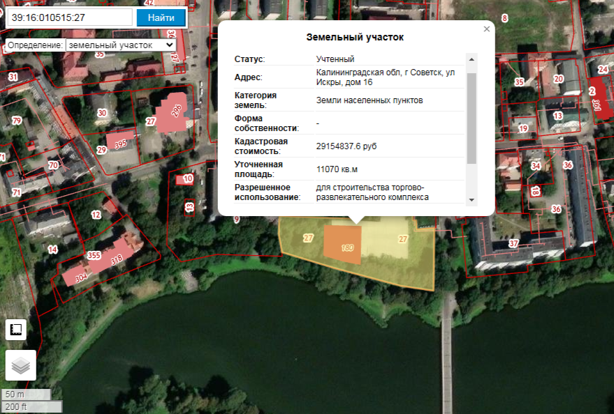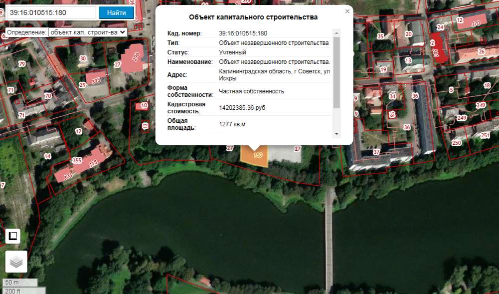 Речь идет об объекте незавершенного строительства с кадастровым номером 39:16:010515:180 площадью 1277 кв. м степенью готовности 30 % на берегу Городского озера в зеленой зоне. Рядом находится консульство Литовской Республики в Советске. На кадастр объект был поставлен еще в марте 2014 года. Его кадастровая стоимость превышает 14,2 млн руб. При этом участок под недостроем 39:16:010515:27 площадью 1,1 га имеет вид разрешенного использования «для строительства торгово-развлекательного комплекса» и кадастровую стоимость свыше 29 млн руб. Последний раз аренда земли продлевалась в 2017 году.