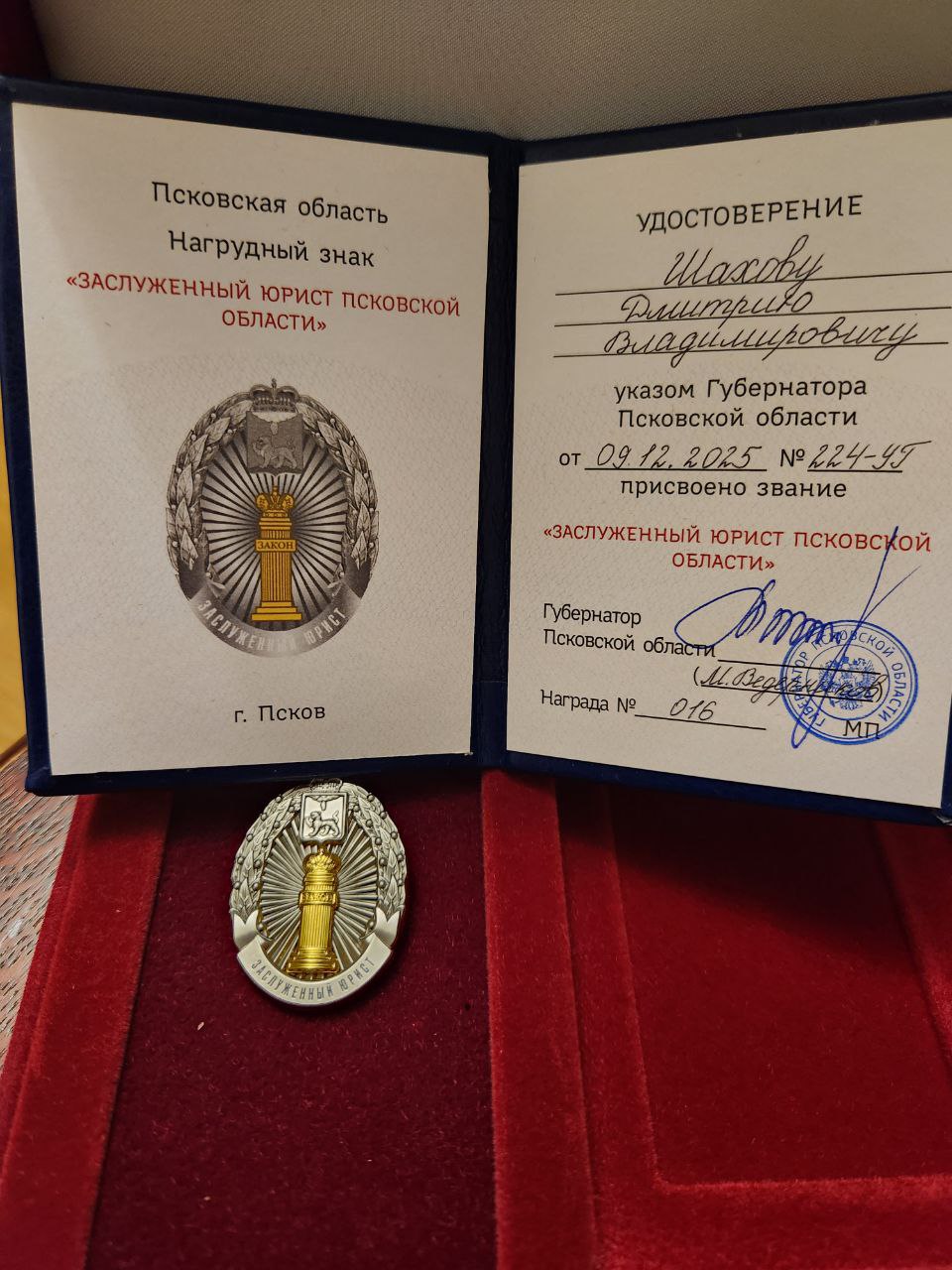 За личные заслуги в защите прав, свобод и законных интересов граждан, укрепление законности и правопорядка на территории Псковской области Указом Губернатора Псковской области № 244-УГ от 9 декабря 2025 года звание «Заслуженный юрист Псковской области» присвоено Уполномоченному по правам человека в Псковской области Дмитрию Шахову.