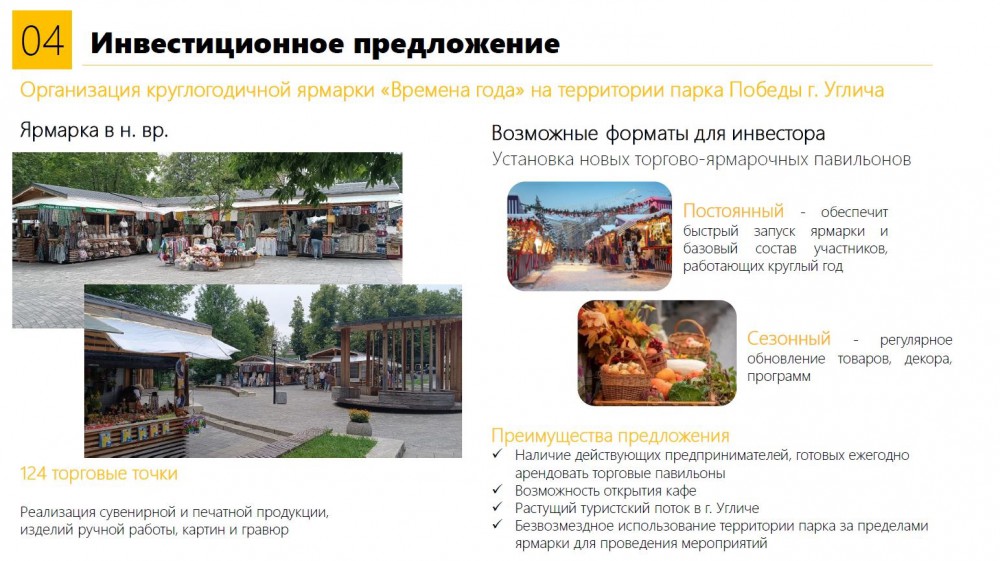 Просим Вас рассмотреть инвестиционное предложение по созданию круглогодичной ярмарки «Времена года», размещаемой на площадке парка Победы города Углича.