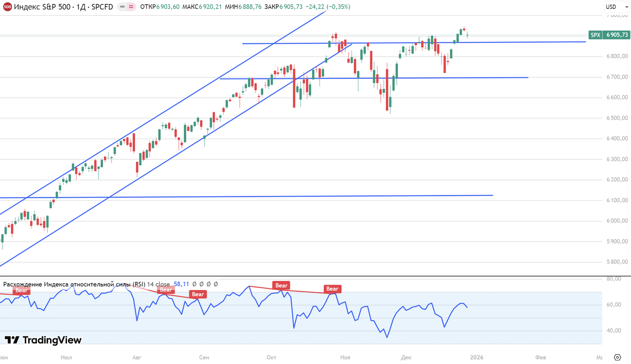 Индекс S&P 500 сейчас на дневном графике может сформировать длительный растущий тренд после новогодних неторговых сессий. Индексу удалось закрепиться выше предыдущего максимума, и уровень 6870 теперь является крепким уровнем поддержки в случае негатива в новостном фоне. Перекупленности на рынке нет, что позволит ему продолжить рост в ближайшие торговые сессии.