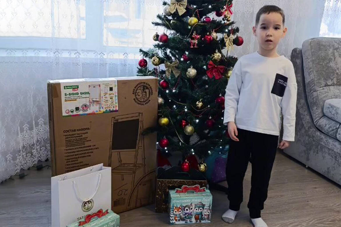 Шестилетний Ильдан Булатов из Старого Шигалеево Пестречинского района получил мольберт и сладкий подарок, которые он попросил в письме. Ильдан — ребенок с инвалидностью, любознательный и веселый, любит прогулки, игры, мультфильмы и музыку. Мама отмечает его старания учиться новому и адаптироваться к миру.