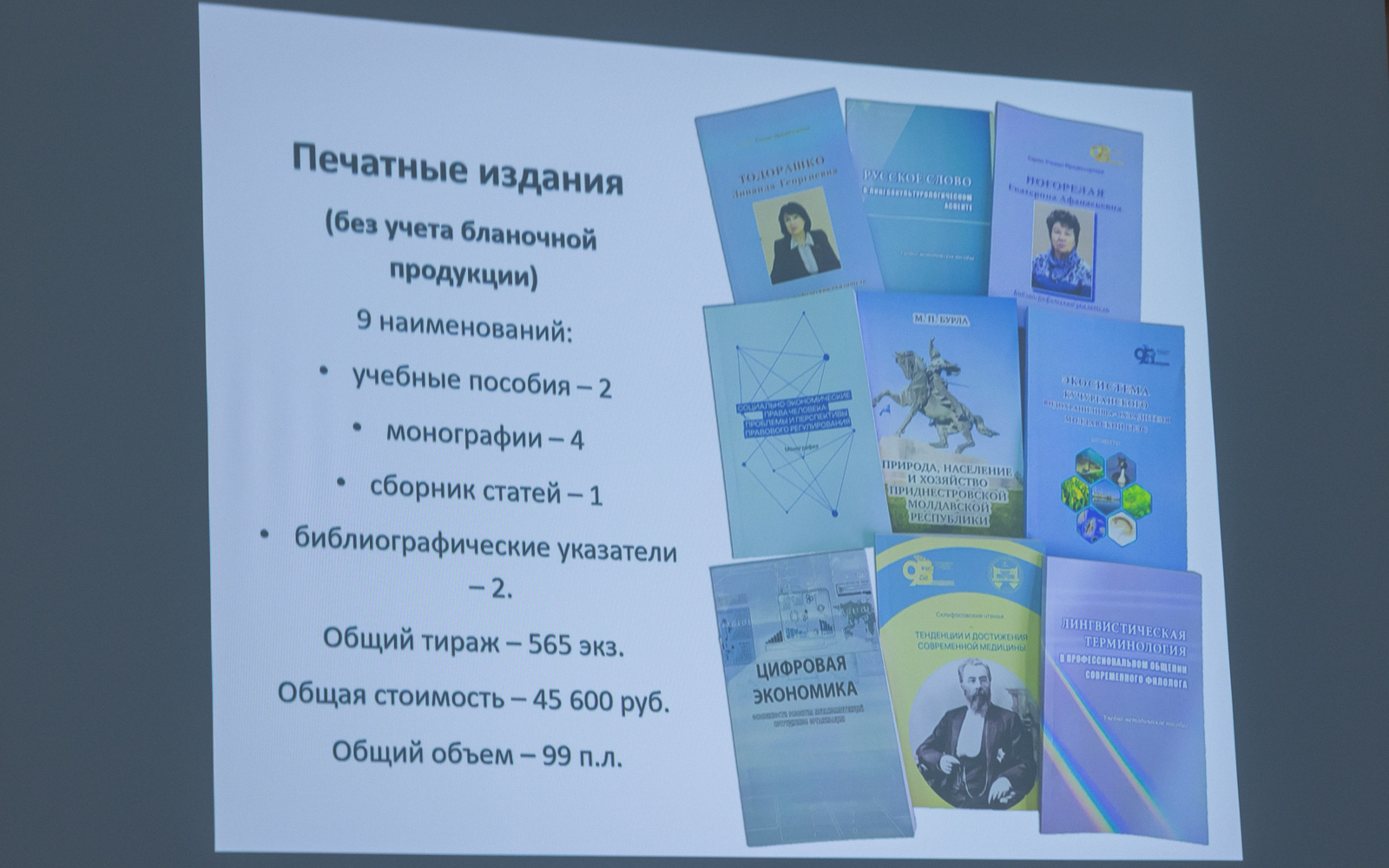 Отчет об издательской деятельности ПГУ за 2025 год и план поступления рукописей на 2026 год представила директор издательства «Приднестровский университет» доцент В.В. Дабежа. Как отметила Виктория Владимировна, всего в 2025 году было выпущено 229 наименований печатной продукции, из которых наибольшую долю составили электронные издания – 129 наименований общим объёмом 995,5 печатного листа. Печатные издания представлены 9 наименованиями научной и учебной литературы объёмом 99 печатных листов. Бланочная и представительская продукция включила 91 наименование с общим тиражом 36 649 экземпляров. Совокупный объём электронных и печатных научных и учебных изданий (без учёта бланочной продукции) составил около 1095 печатных листов, а общий тираж всей выпущенной продукции – около 37 тысяч экземпляров, что свидетельствует о стабильной и системной работе издательства. Ученый совет принял решение утвердить отчет об издательской деятельности вуза и план поступления рукописей на 2026 год.