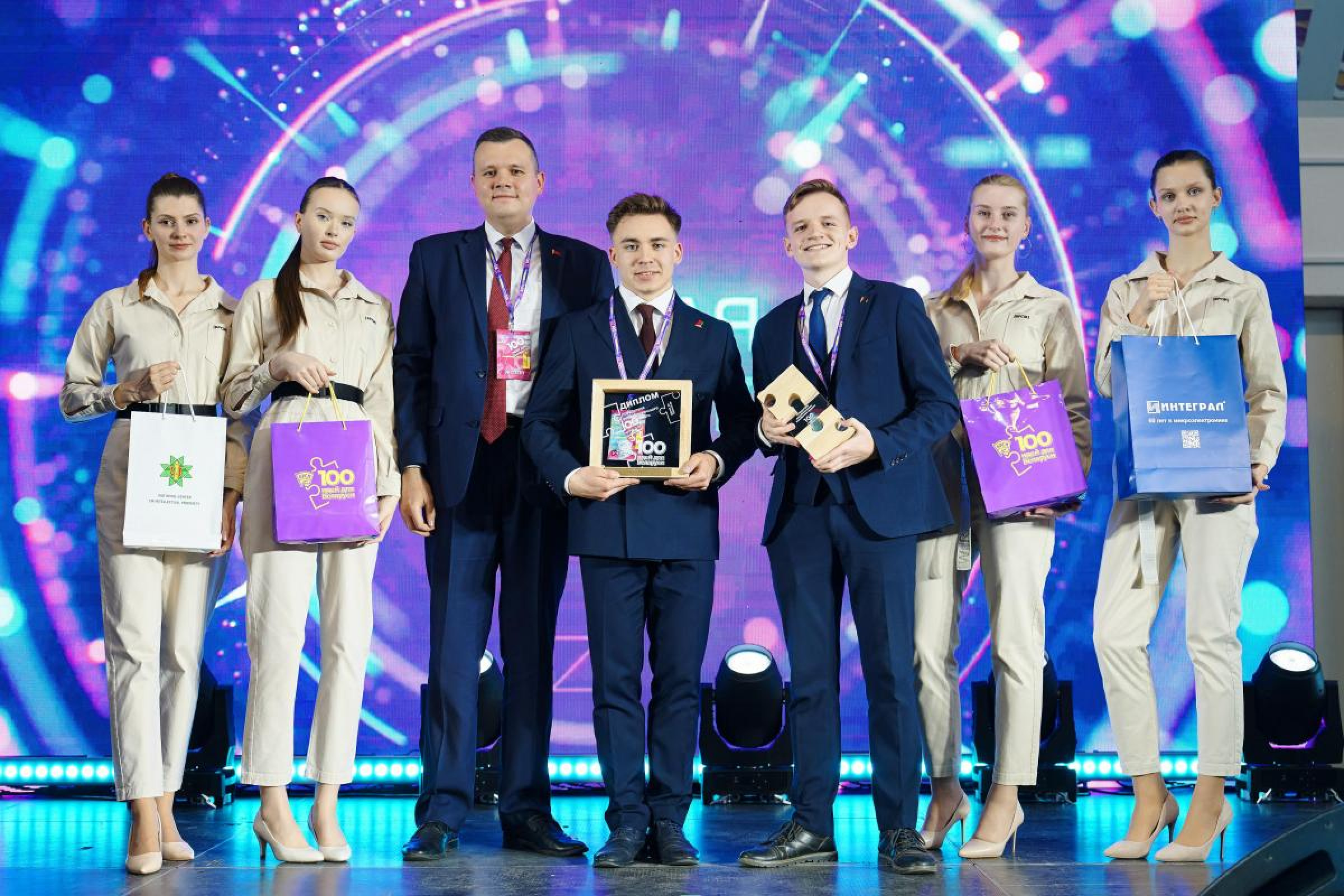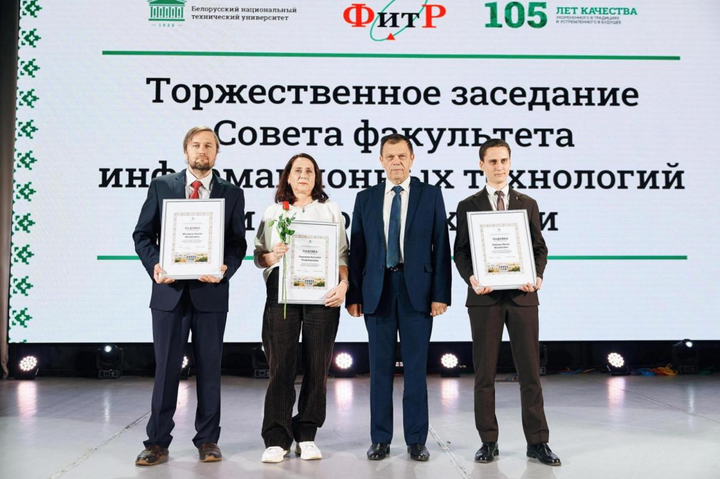 Денежных премий были удостоены победители XIII Республиканского конкурса научно-технического творчества учащейся молодежи «ТехноИнтеллект – 2024»: учащиеся Лицея БНТУЕвгения ЕфименкоиМария Правдивец, а также победители республиканского молодежного проекта «100 идей для Беларуси» – выпускники факультета информационных технологий и робототехникиАлександра Бортник,Артем ГрадусовиДаниил Дрозд.
