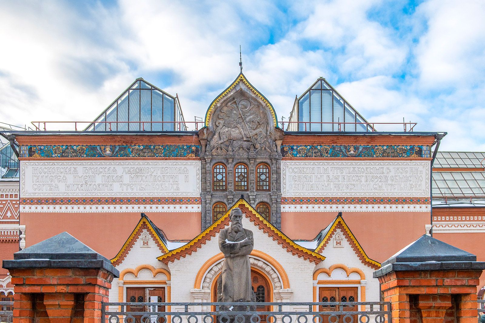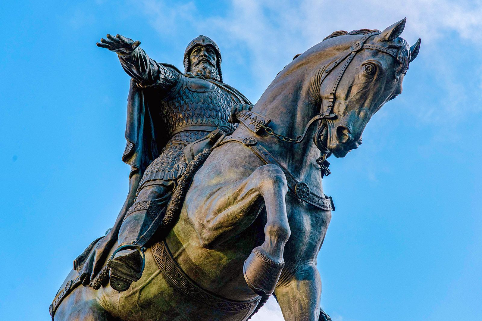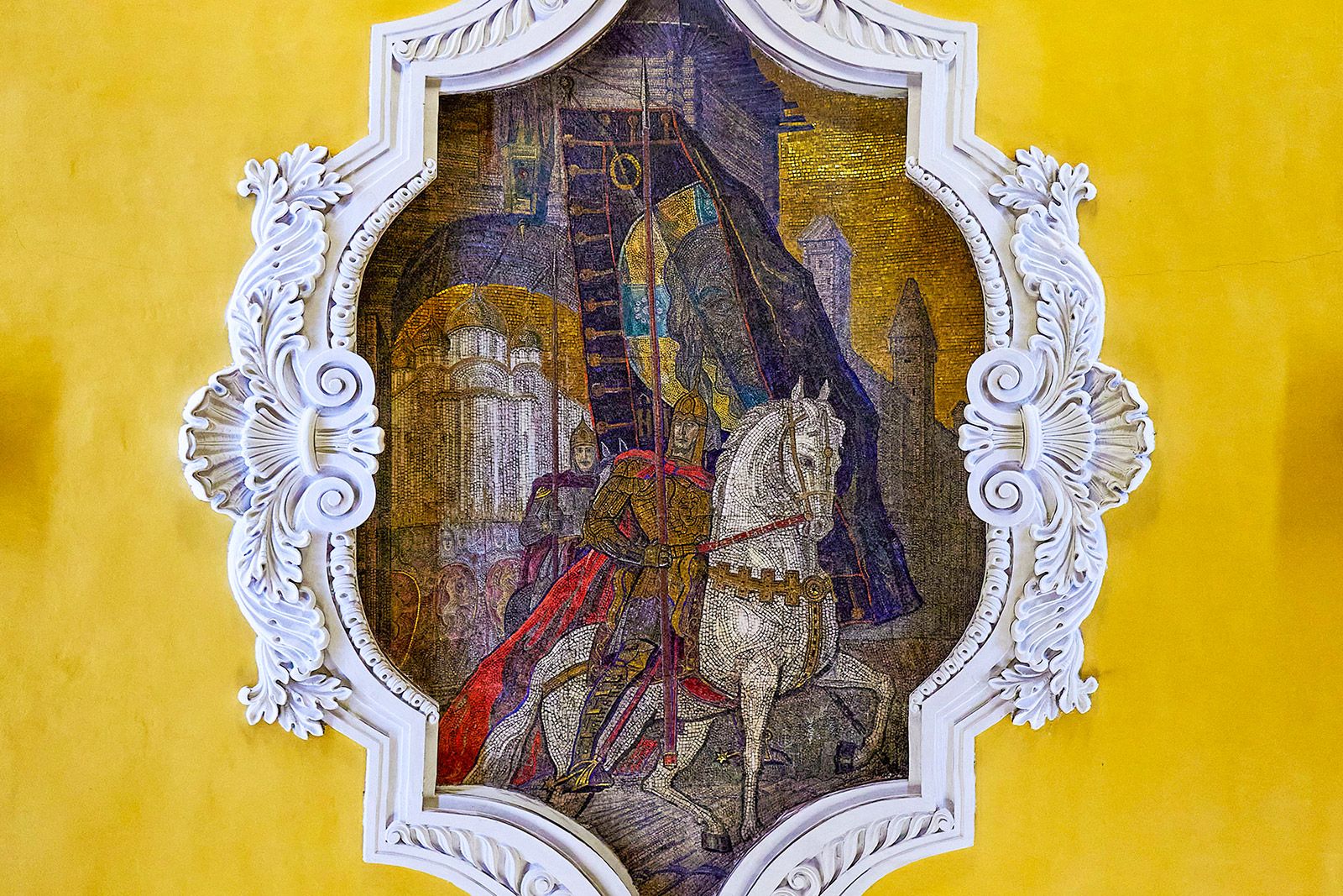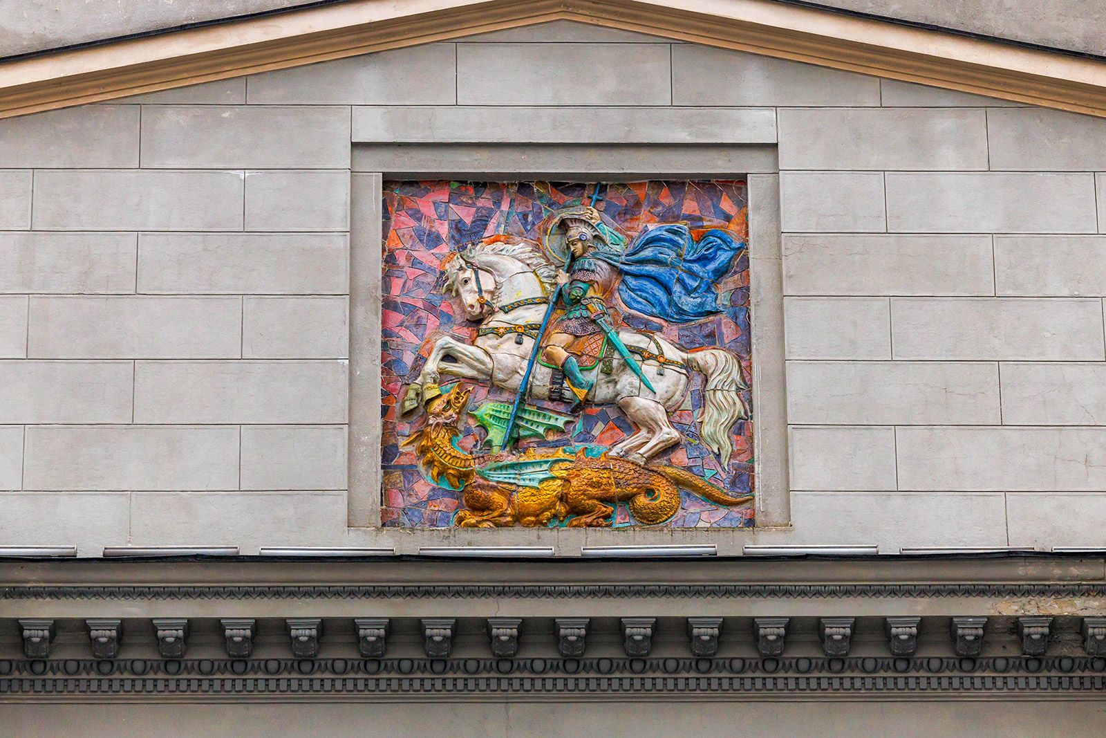 Теперь конь воплощал собой помощника: он служил своему господину, который исполнял божественную волю. Яркий образ — Георгий Победоносец, главный герой герба Москвы. Он олицетворяет собой борца с иноземными завоевателями, народного защитника. Всадник в доспехах и голубом плаще, сидя на серебряном коне, поражает золотым копьем черного змея. Эту же сцену мы видим на барельефе, украшающем фасад здания Третьяковской галереи в Лаврушинском переулке, и на керамическом панно на здании Киевского вокзала. Лошадь была неотъемлемой частью образа и русских князей. Юрий Долгорукий, основатель Москвы, тоже предстает перед нами на Тверской площади верхом на боевом коне