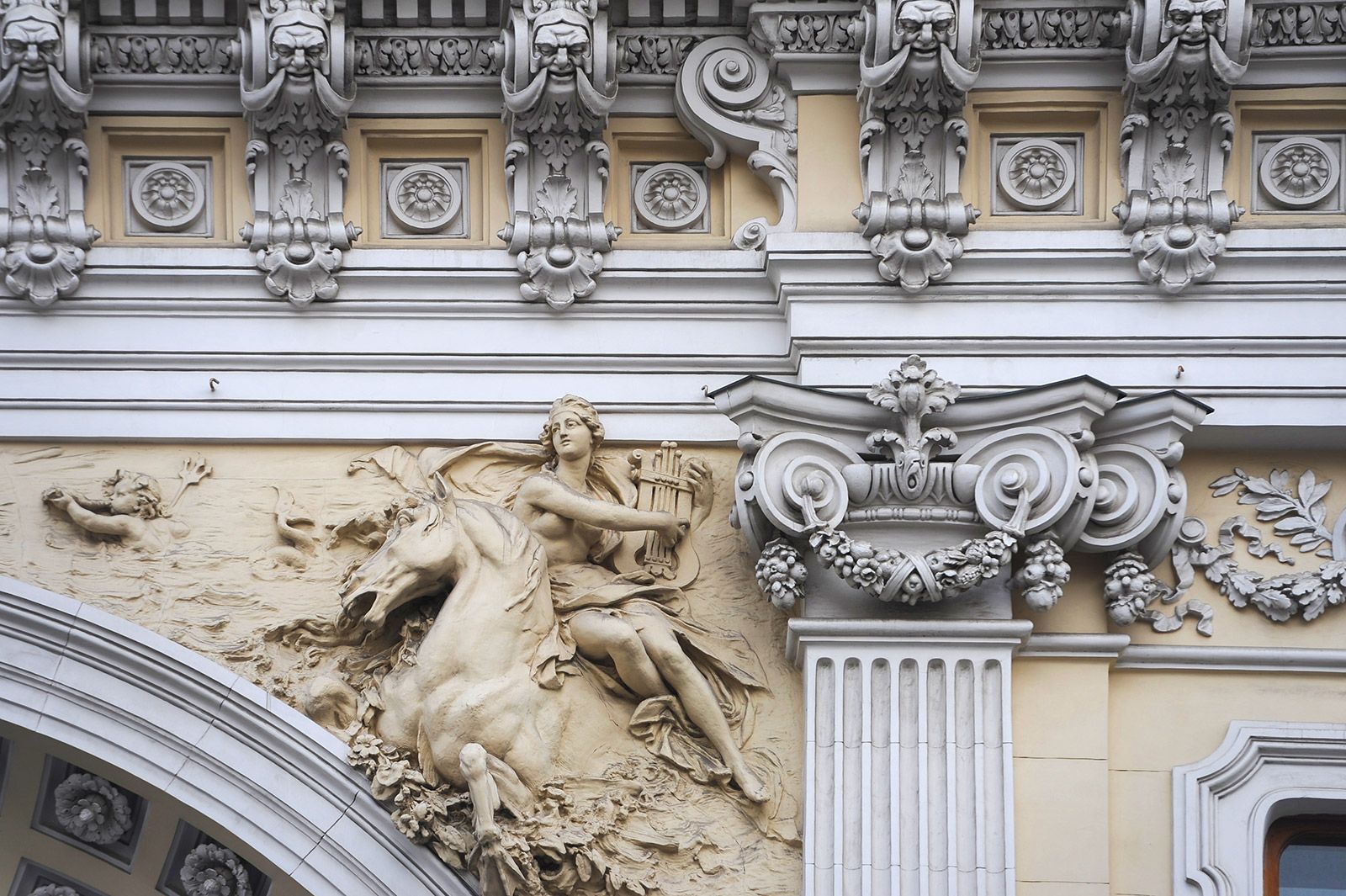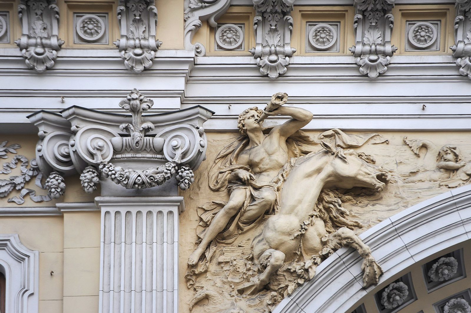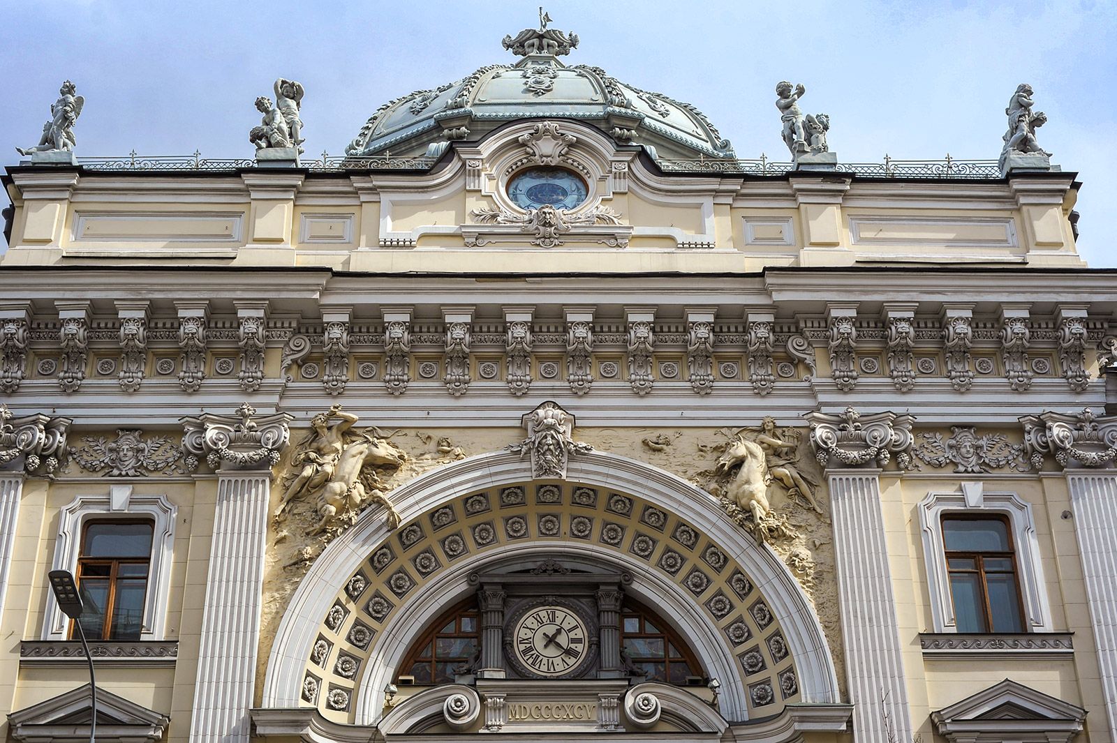 Еще в XIX веке в архитектурную моду вошли мифические животные. Сандуновские бани — трехэтажный дворец в стиле бозар — украсили элементы барокко, ренессанса, рококо, готики, классицизма. Над грандиозной аркой вылеплены словно вырывающиеся из фасада гиппокампы, морские кони бога Посейдона. На правом скакуне сидит нереида (нимфа), на левом — сын водного владыки Тритон, который трубит в рог.