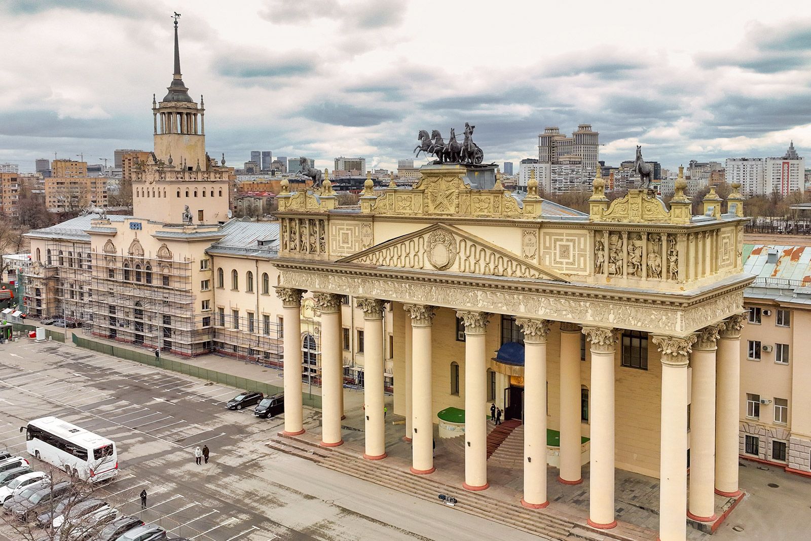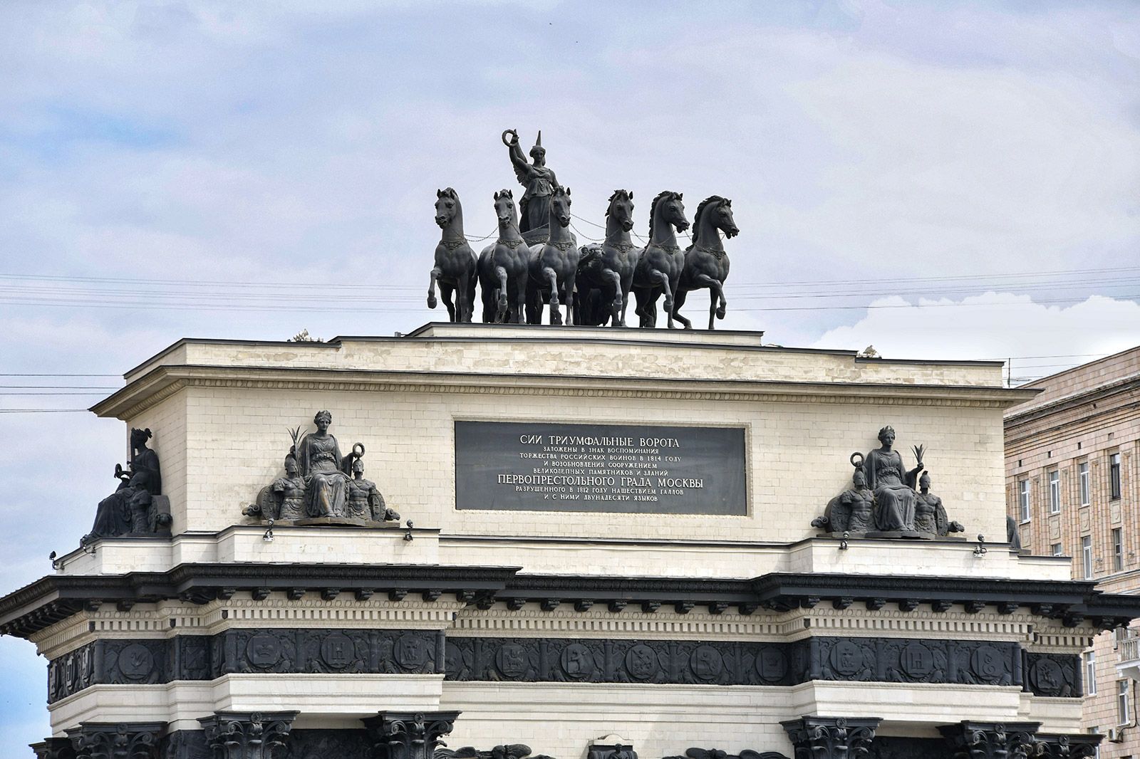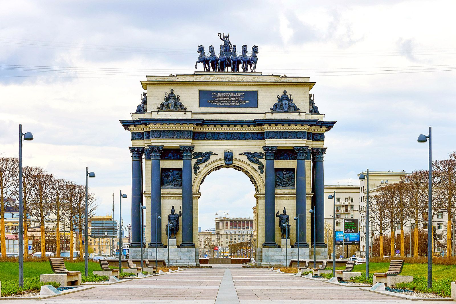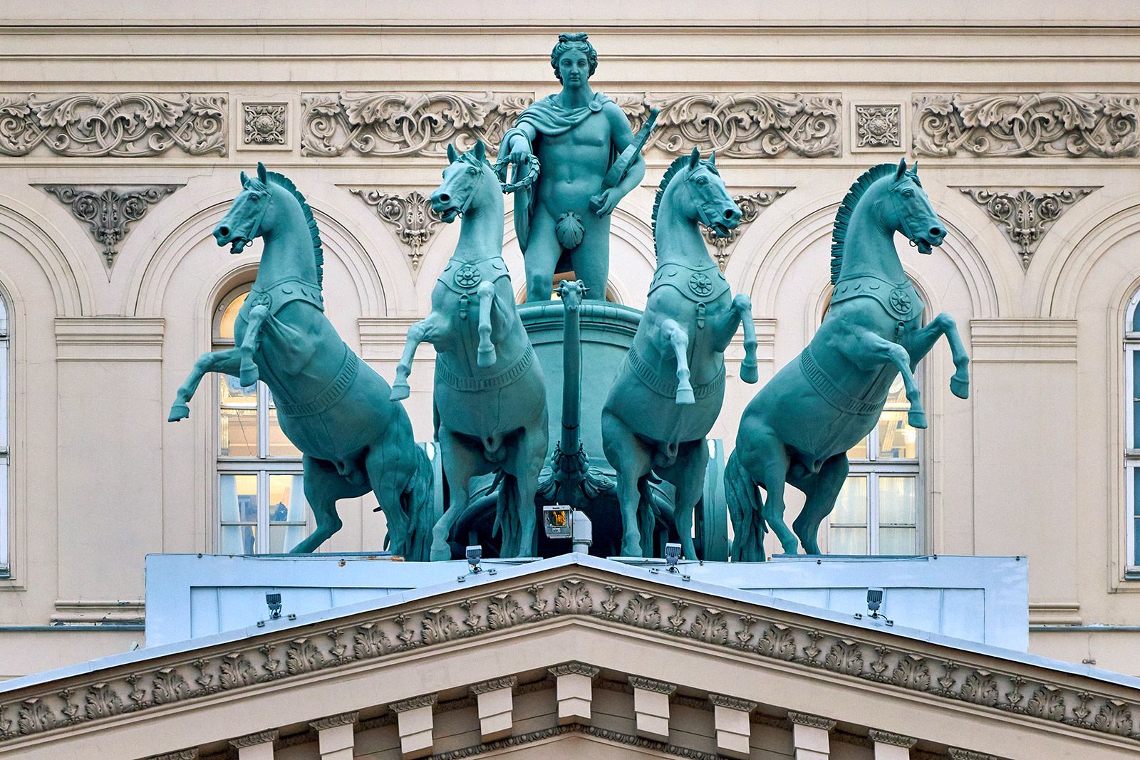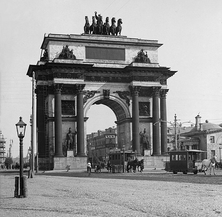 «Классицизм вернул древние традиции, и архитектура заговорила на античном языке через символизм. Стилю присущи строгие формы и обилие декоративных элементов: щитов, венков, оружия, образов лошадей. Последние вышли из тени всадника. К 1834 году на площади Тверская Застава построили памятник в честь победы русской армии над Наполеоном — Триумфальные ворота. Их венчает колесница, запряженная шестеркой лошадей, которой управляет богиня победы Ника. Кони, как и крылатая возница, олицетворяют военную мощь страны. А с 1856 года на портике Большого театра возвышается бронзовая квадрига Аполлона, удерживающего лошадей мощной рукой. Это символ покровительства искусству, творческого полета. Кроме того, квадриги использовали как аллегорию государственной власти. Вставшие на дыбы лошади отражали энергию, прогресс эпохи, а империя как бы управляла движением, сохраняя порядок. Так в Риме изображали правителей и легионеров», — отметила экскурсовод.