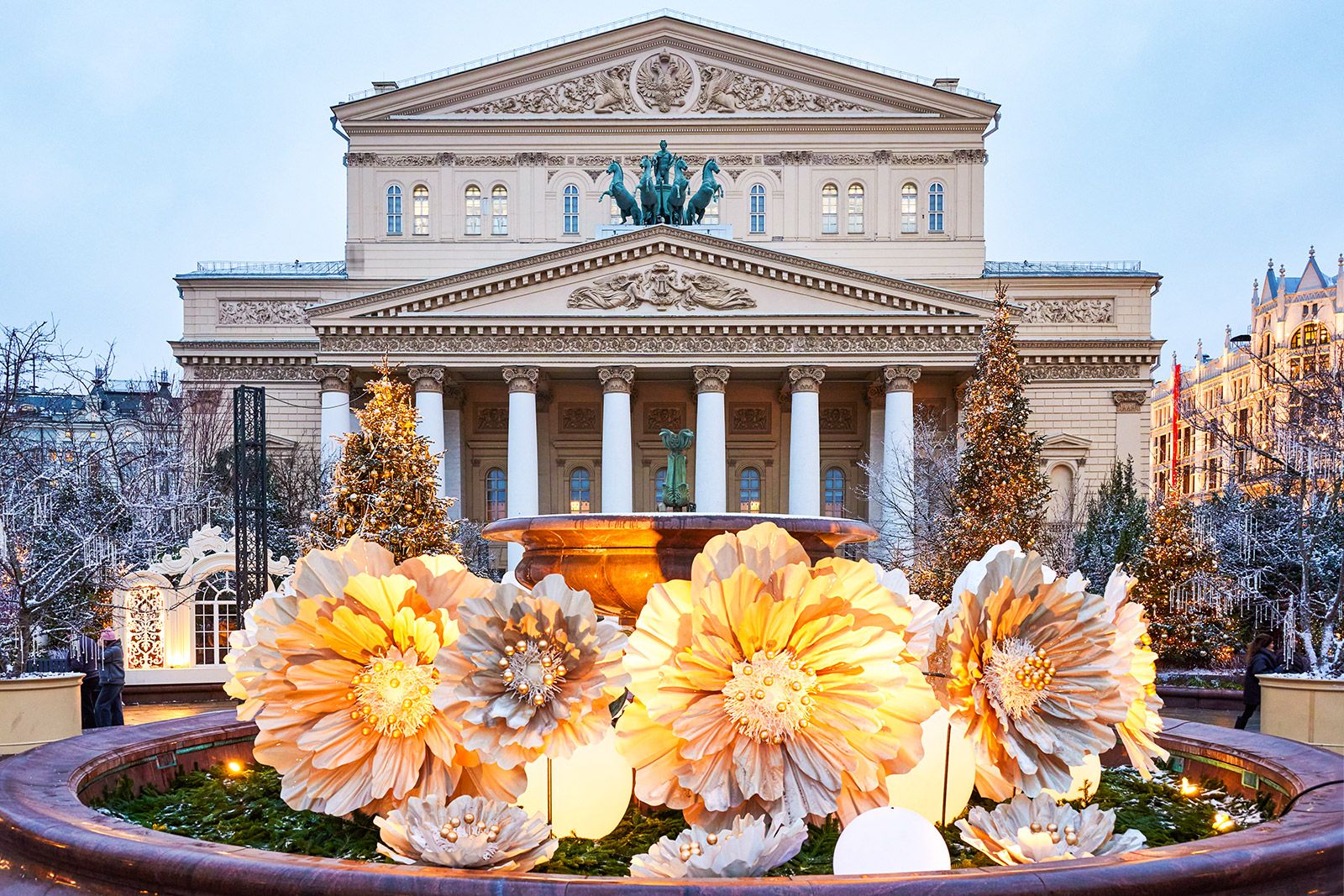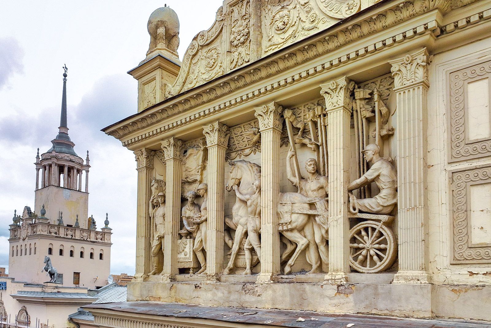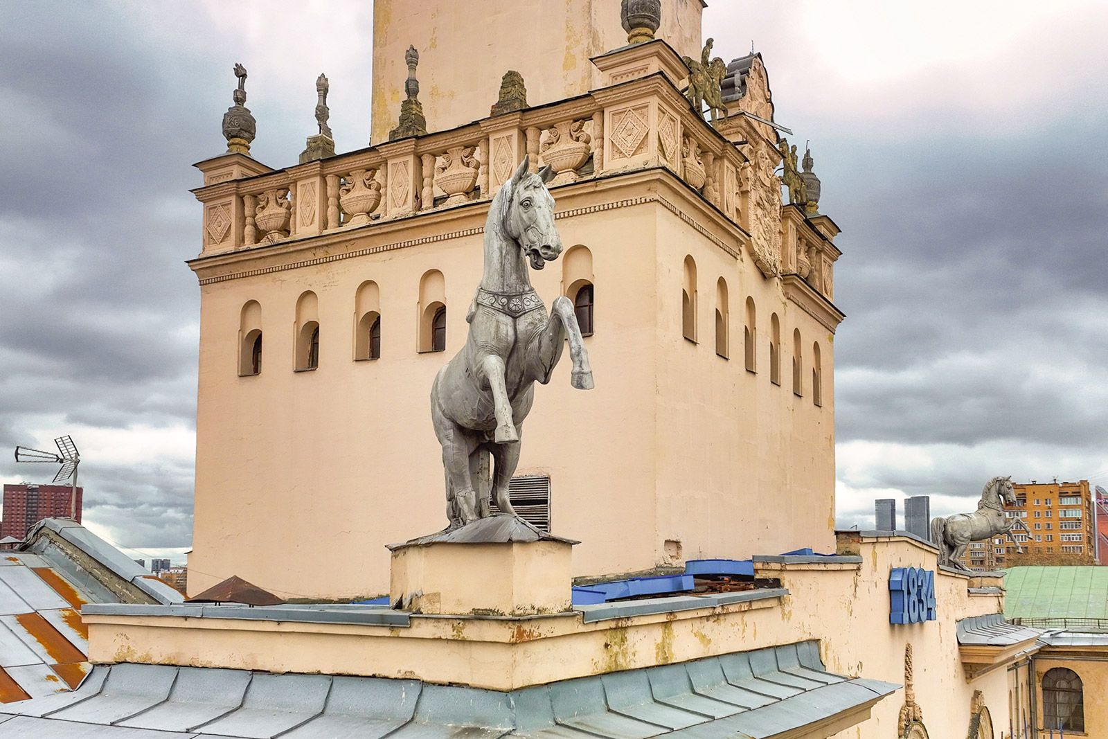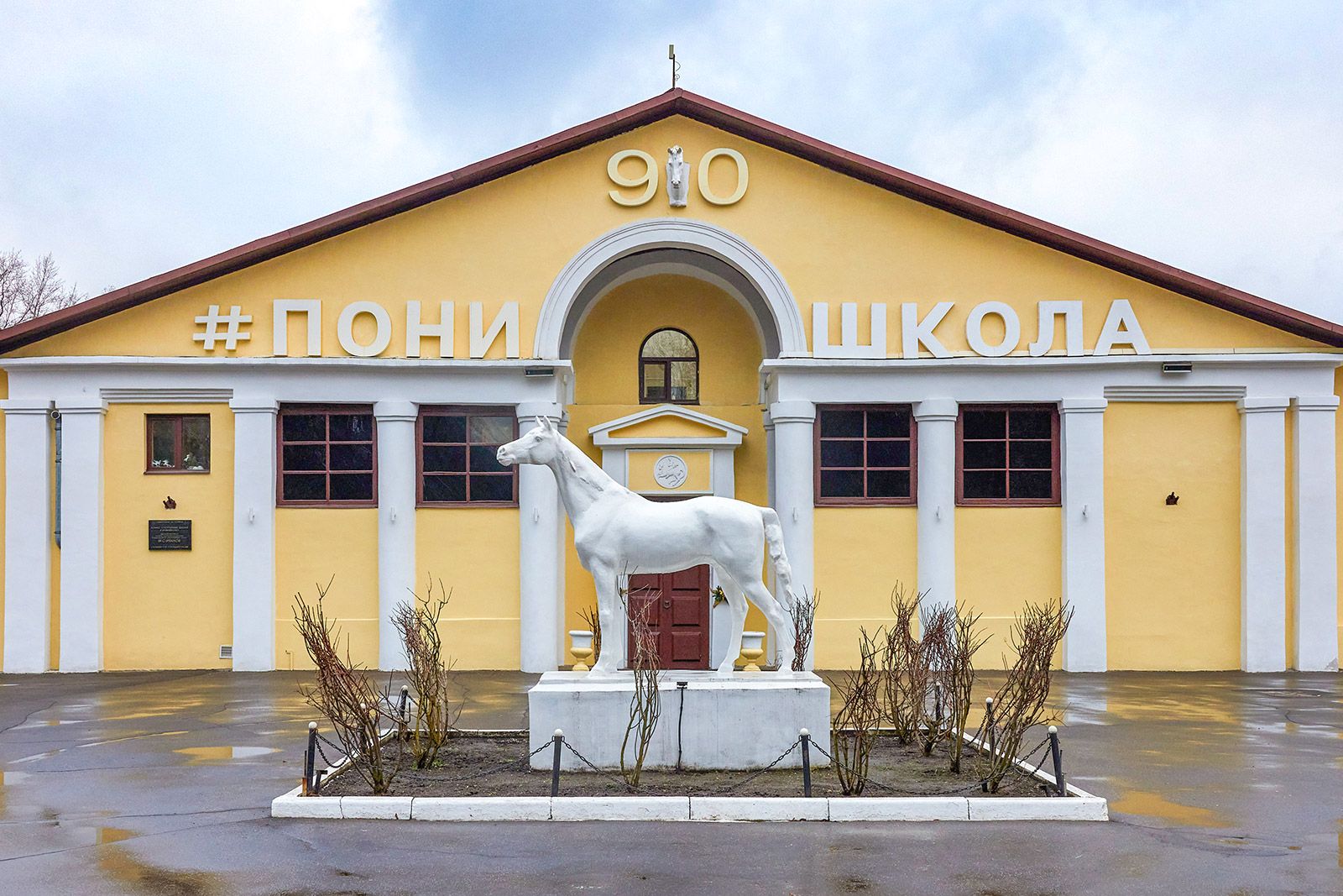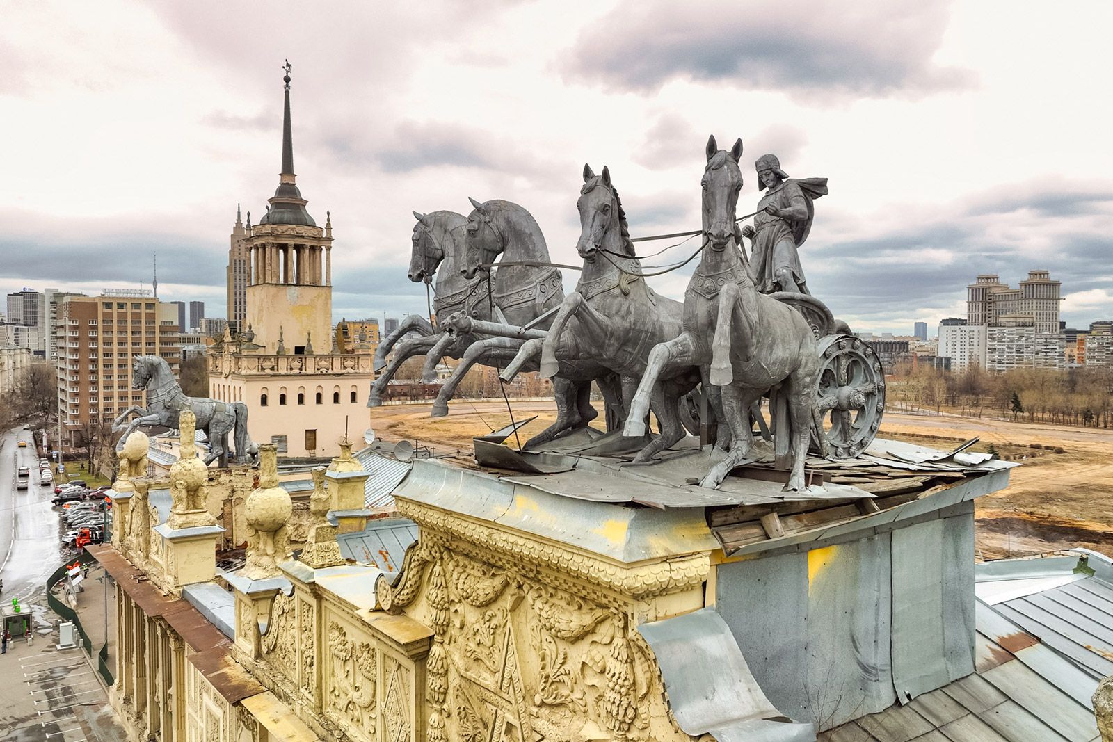 В столице можно найти квадригу и на фасаде здания Московского ипподрома. Это первый в мире рысистый ипподром. Он открылся на территории Ходынского поля в 1834 году. К концу века соорудили первое здание с двумя квадригами, но после пожара 1949-го его пришлось перестроить. Скульптуры удалось сохранить: одну установили по центру фасада, других лошадей расставили по углам здания. Сейчас памятник архитектуры реставрируют, после чего он вновь примет любителей конного спорта.