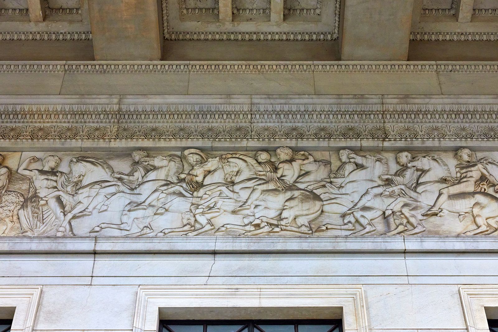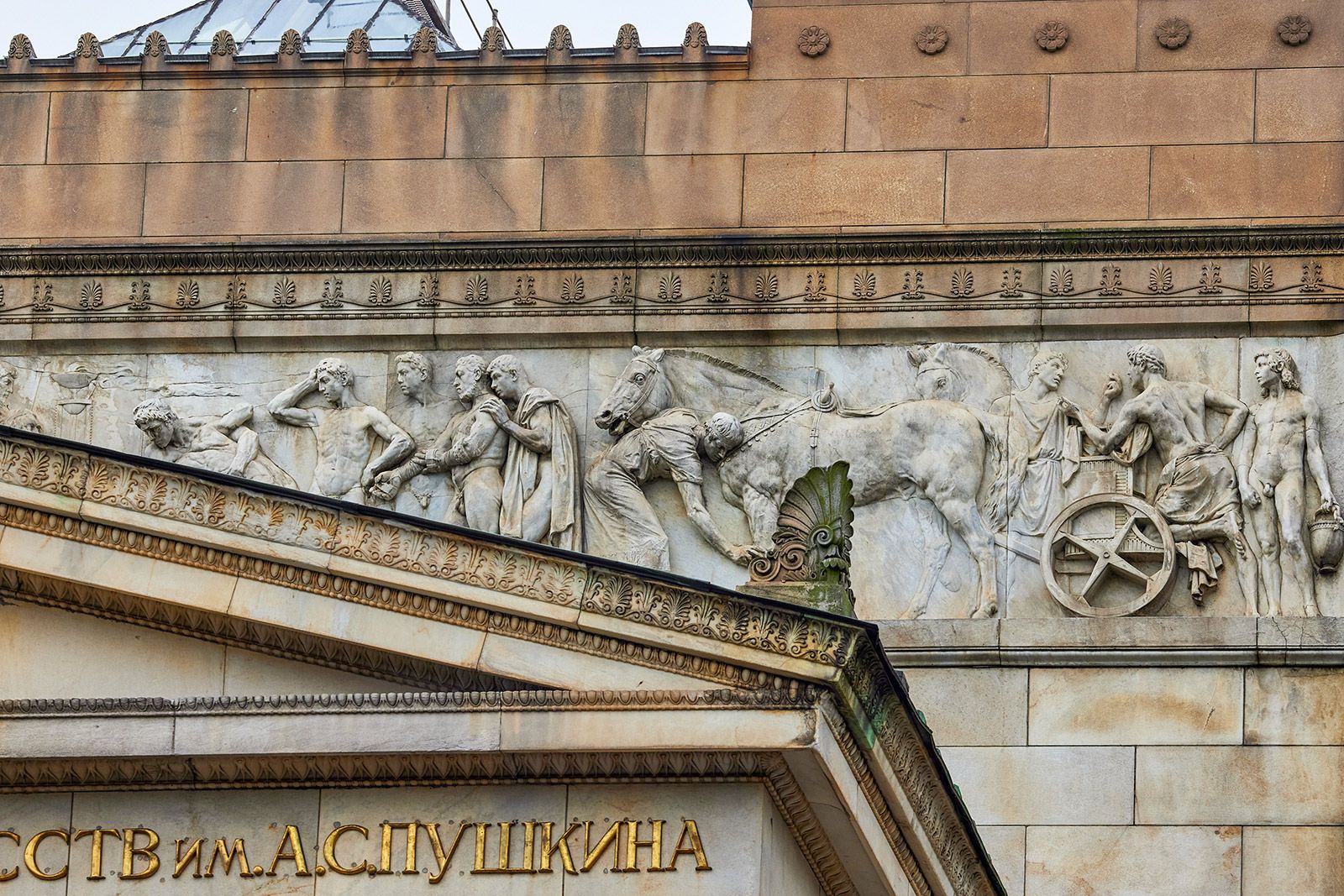 А скульптурный фриз на фасаде Государственного музея изобразительных искусств имени А.С. Пушкина иллюстрирует сцену из Олимпийских игр, среди участников которых есть и конь. Спорт и искусство связаны не случайно: в античности верили, что они неразрывны, так как воспитывают тело и дух человека.