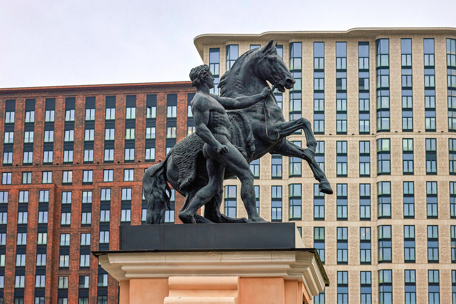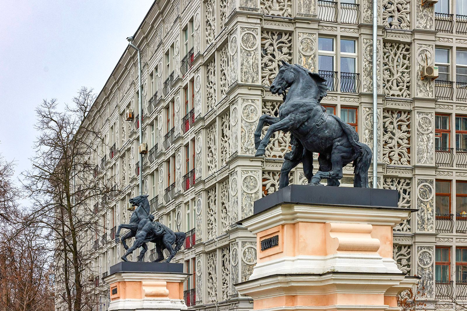 Московские мастера нередко вдохновлялись мифом о Диоскурах, сыновьях Зевса. Эти близнецы прославились, побеждая врагов и приручая диких лошадей. В 1899 году на Беговой аллее установили две бронзовые скульптуры «Диоскуры, укрощающие коней». Один конь встал на дыбы и пытается вырваться, но юноша уже накрыл его спину попоной. Второй еще взволнован, но подчинен и даже подкован, он следует за молодым человеком. Похожие скульптуры украшают конный двор в усадьбе Кузьминки.