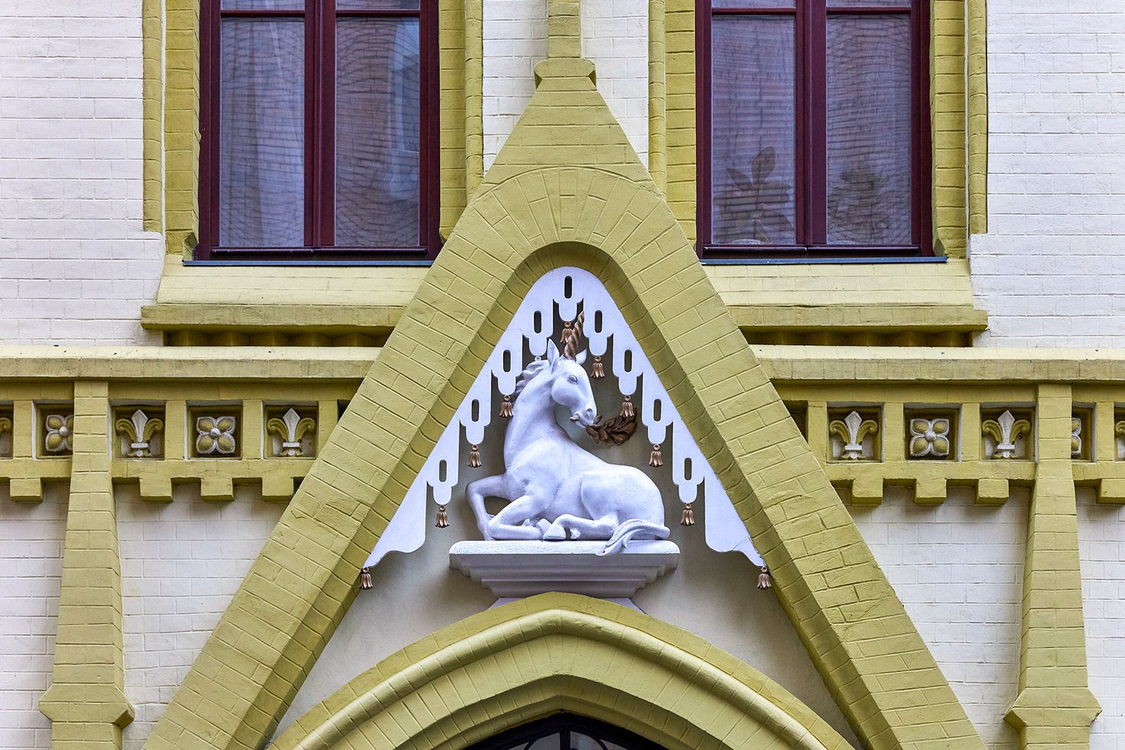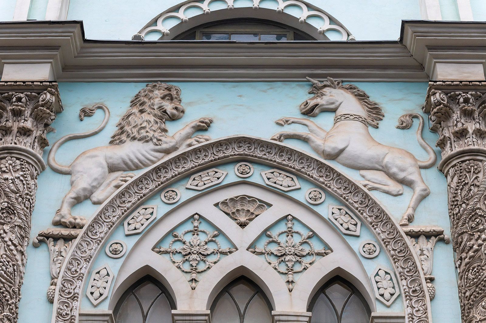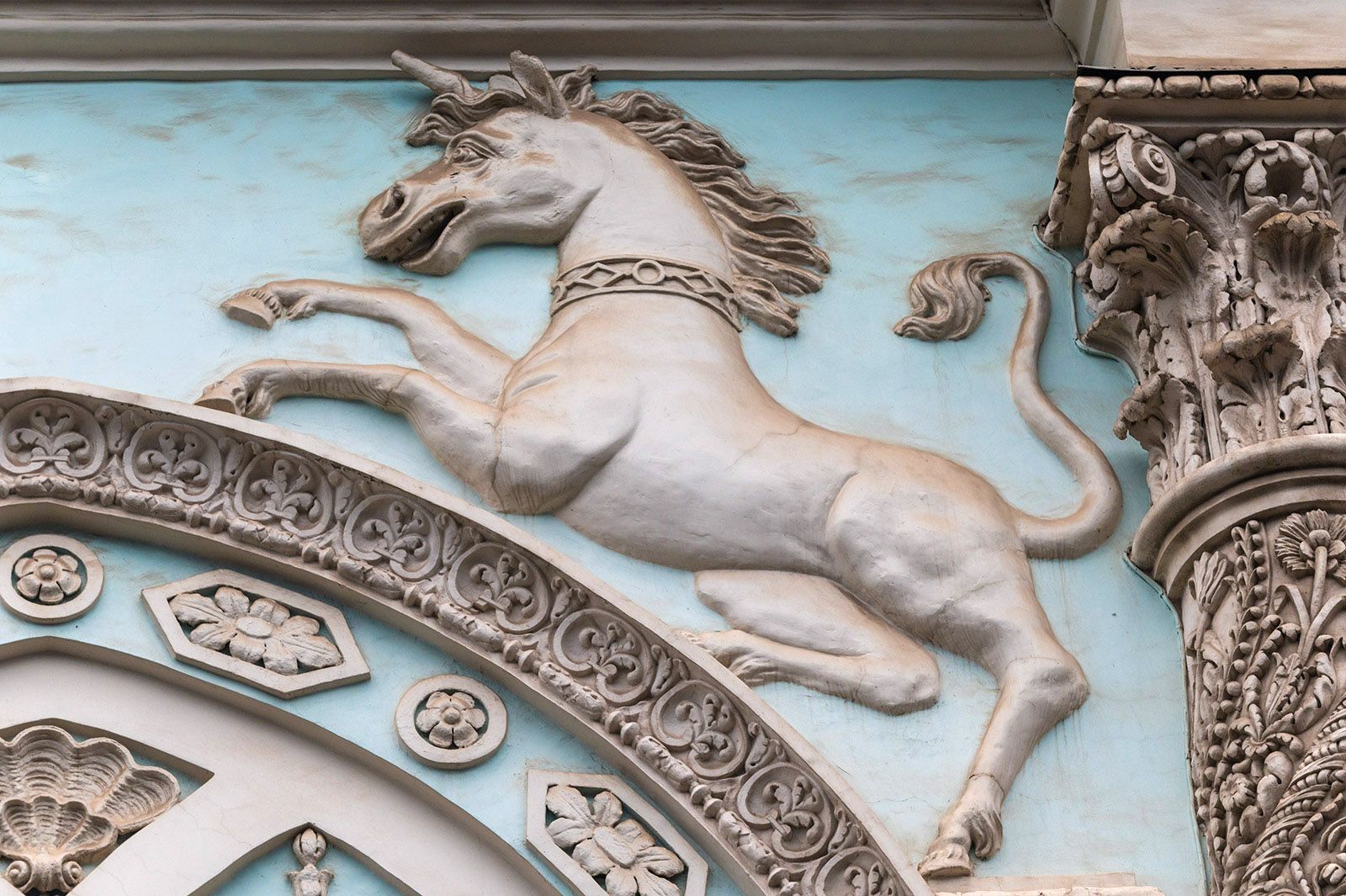 Особенно популярным стал единорог. В XVI веке его помещали на печатях Ивана Грозного как символ власти, и спустя столетия эта аналогия сохранилась. К 1814 году построили здание Синодальной типографии, на фасаде которого появились геральдические персонажи: единорог и лев. Также изображения волшебного существа украшали дома купцов. На фасаде доходного дома Константина Лазарева единорог «отдыхает» в арке подъезда с веточкой в зубах. Правда, барельеф добавили на неоготическое здание во время реконструкции в нашем веке, но он ярко иллюстрирует тренды своей эпохи. Есть в столице и барельеф другой фантастической лошади.