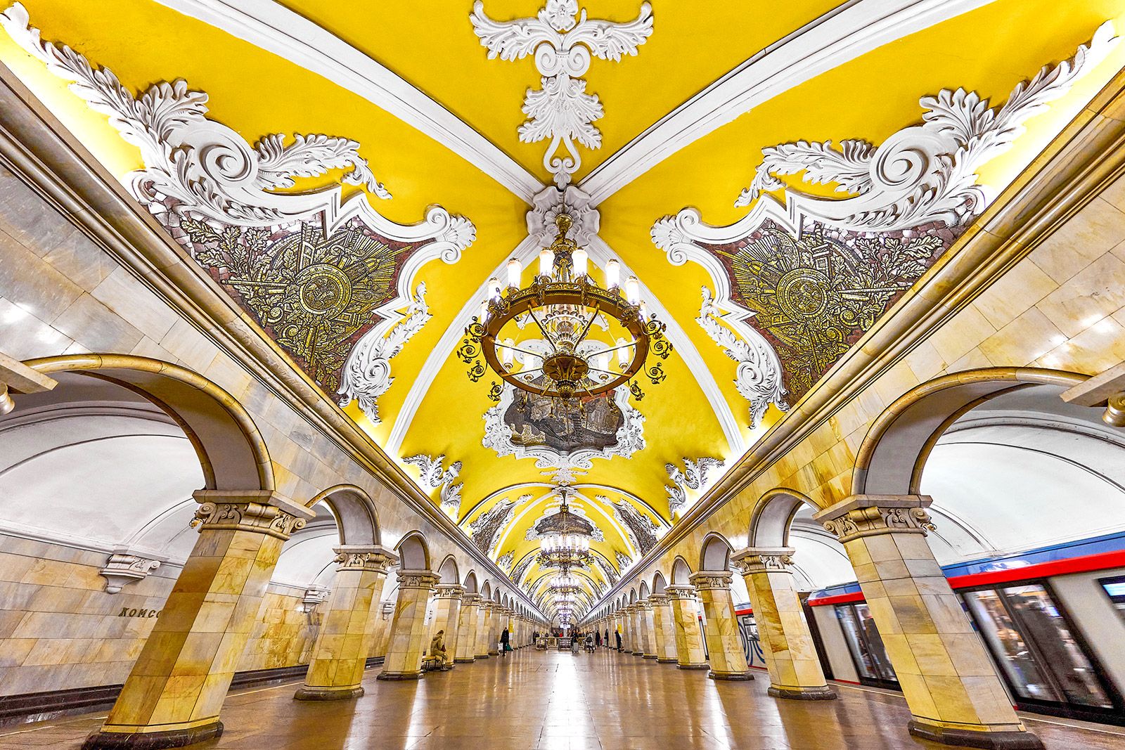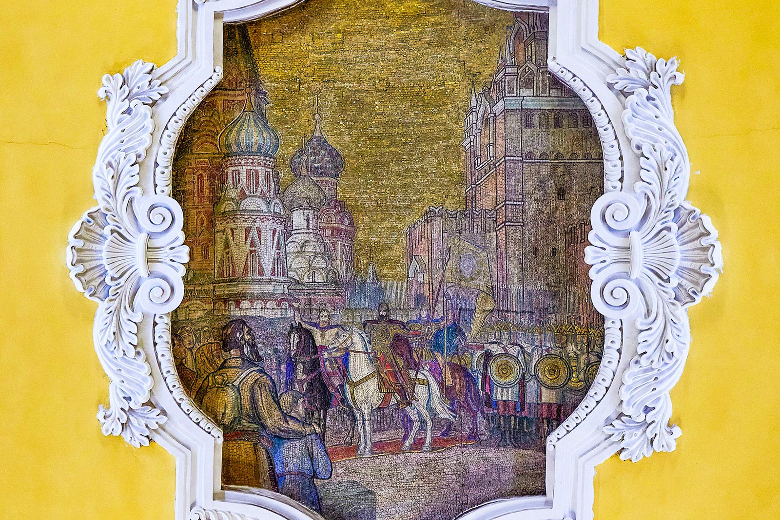 Русские полководцы «приветствуют» москвичей и на «Комсомольской» Кольцевой линии — одной из самых торжественных станций московского метро. Она открылась в 1952 году. Мозаики из смальты на потолке повествуют о сражениях от времен Средневековой Руси до Великой Отечественной войны. Александр Невский, Дмитрий Донской, Александр Суворов, Михаил Кутузов восседают на боевых конях.