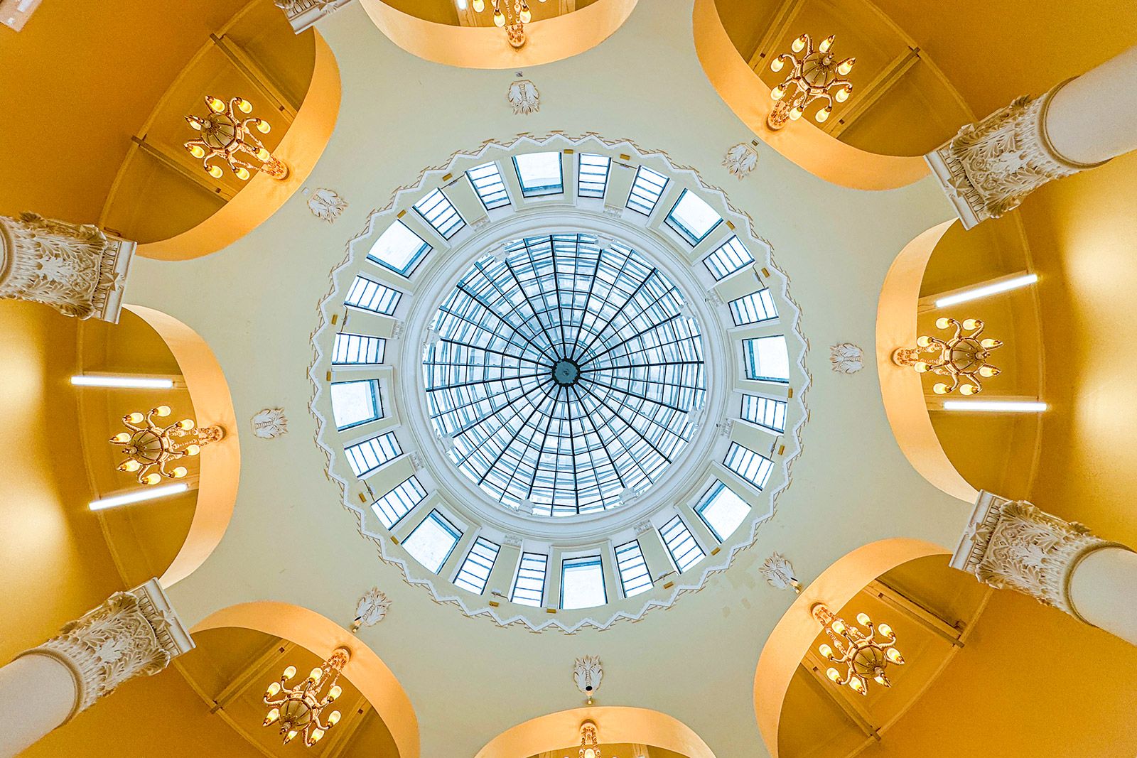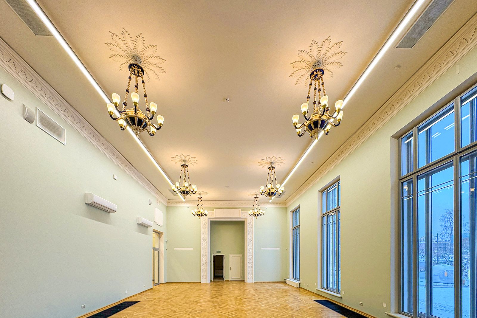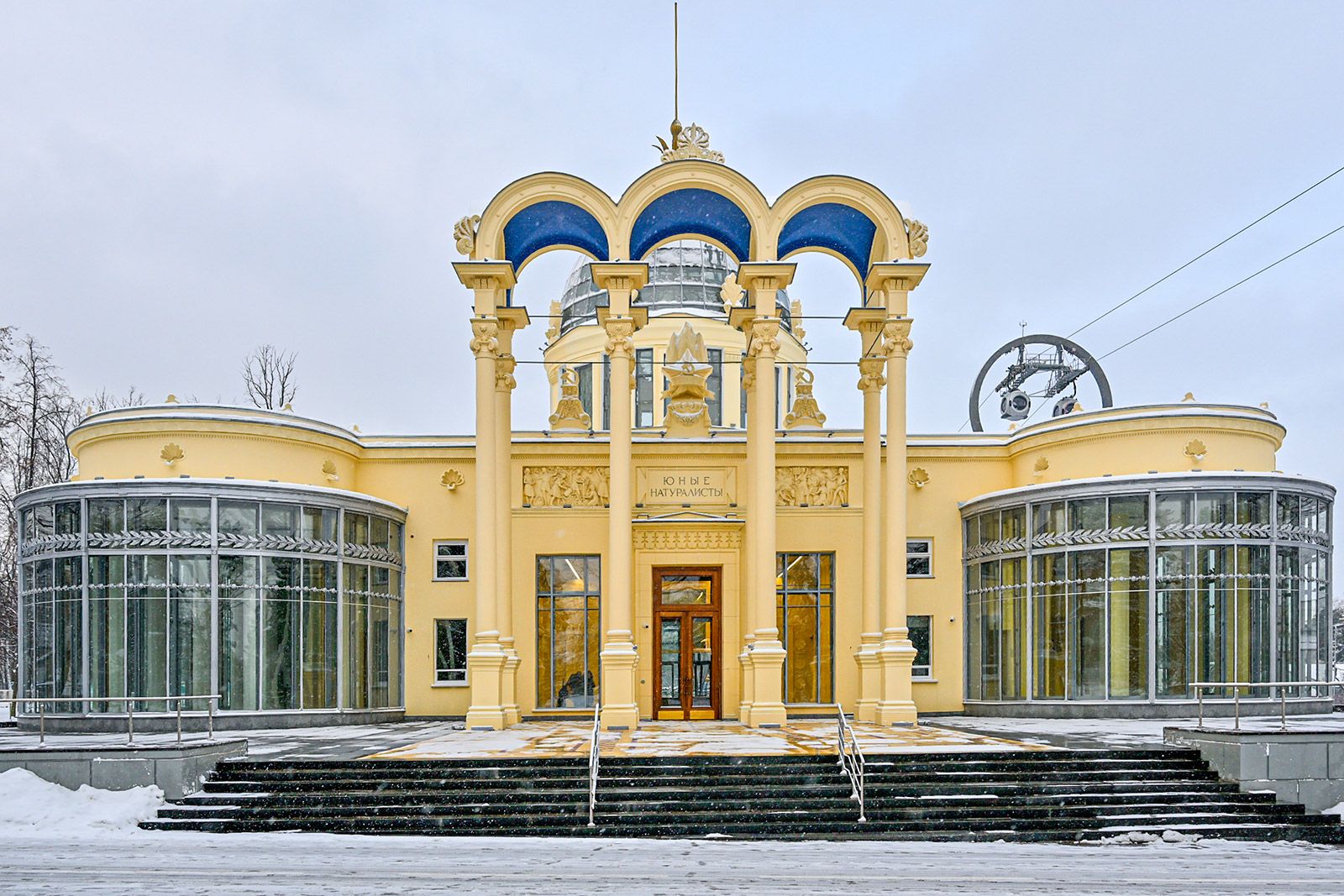 Еще один отреставрированный объект культурного наследия, высокий стеклянный купол которого можно разглядеть с катка, — павильон № 8 «Юные натуралисты». Это здание было построено в 1954 году. В нем привели в порядок колоннаду главного входа, бронзовые бюсты пионеров-героев, декоративную композицию над куполом здания. Отреставрировали входную деревянную дверь и остекление купола, а также восстановили исторические цвета стен в залах павильона. Люстры, барельефы и терраццо стилобата воссоздали по сохранившимся архивным фотографиям. Посетители ВДНХ могут увидеть павильон практически таким же, каким его спроектировала группа молодых советских архитекторов 70 лет назад.