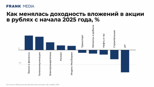 Скромные финансовые результаты не могли не сказаться на биржевой капитализации компаний. По данным Центробанка, с января по ноябрь этого года доходность акций российских ИТ-компаний была наихудшей среди других отраслей. Она оказалась в глубоком минусе, который составил в среднем -15,2%. Показатели других отраслей-аутсайдеров оказались значительно лучше. Так, доходность акций строительной отрасли составила -6,3%, нефтегазовой -3,1%, у металлургов -2,4%, а у транспортной -1,9%. В плюсе оказалась доходность по акциям банков, электроэнергетики, ритейла и телекома. Доходность акций ИТ-компаний с 2022 года составила вовсе -46,6%. Хуже нее оказалась только строительная отрасль с показателем -53,3%.