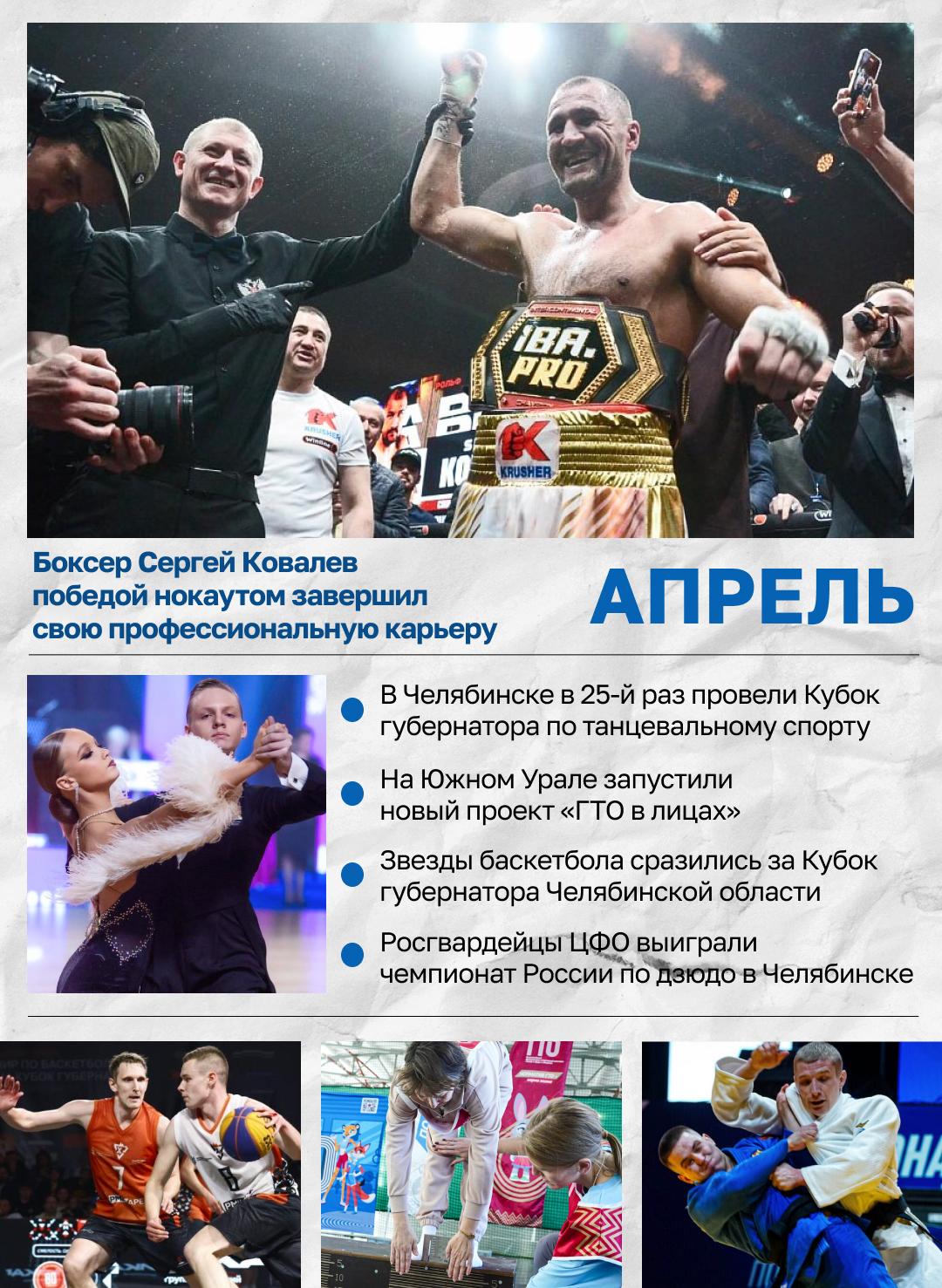Апрель. В челябинском ДС «Юность» прошел крутой вечер профессионального бокса IBA. PRO. Зрители увидели 10 классных боев, а в главном из них Сергей Ковалев нокаутировал немца Артура Манна и объявил о завершении карьеры