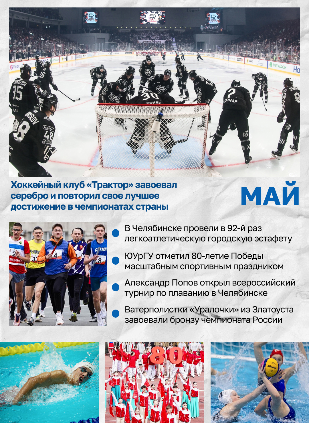 Май. Хоккеисты челябинского «Трактора» завершили выступление в КХЛ, завоевав серебряные медали. Наша команда дошла до финала Кубка Гагарина, но осталась без трофея, уступив «Локомотиву» в серии 1-4.