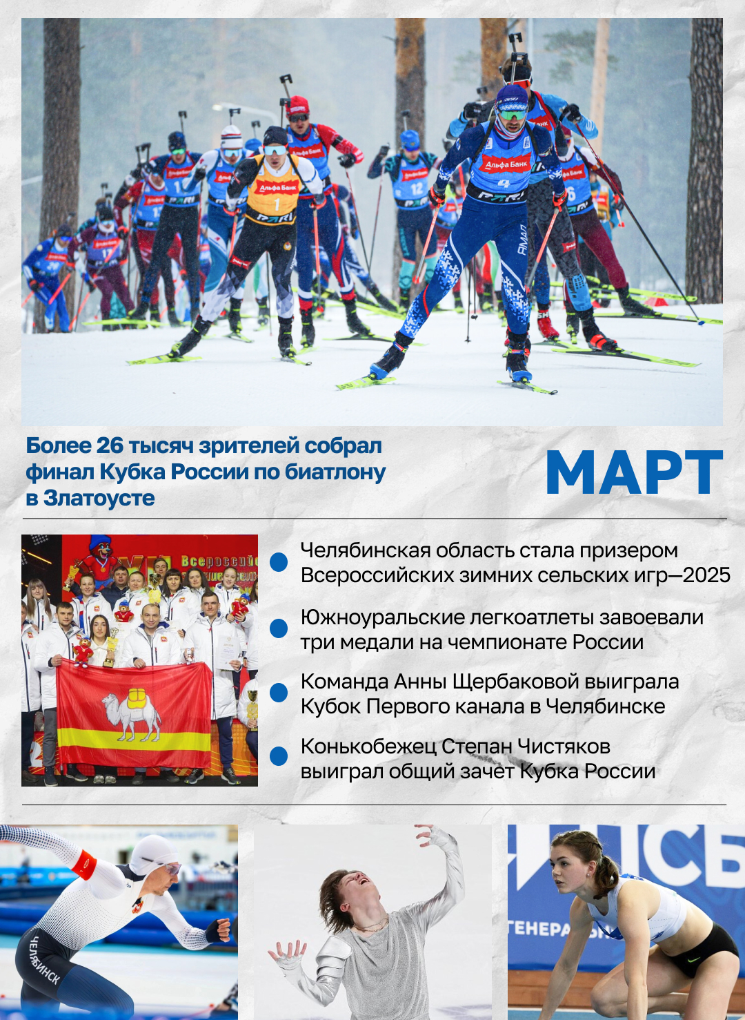 Один из ключевых стартов сезона для сильнейших биатлонистов страны состоялся с 7 по 9 марта на лыжно-биатлонном комплексе им. С. Ишмуратовой. На турнир в Златоуст приехали 107 спортсменов из 17 регионов. Глава Союза биатлонистов России Виктор Майгуров сообщил, что состязания в Златоусте могут стать ежегодными.