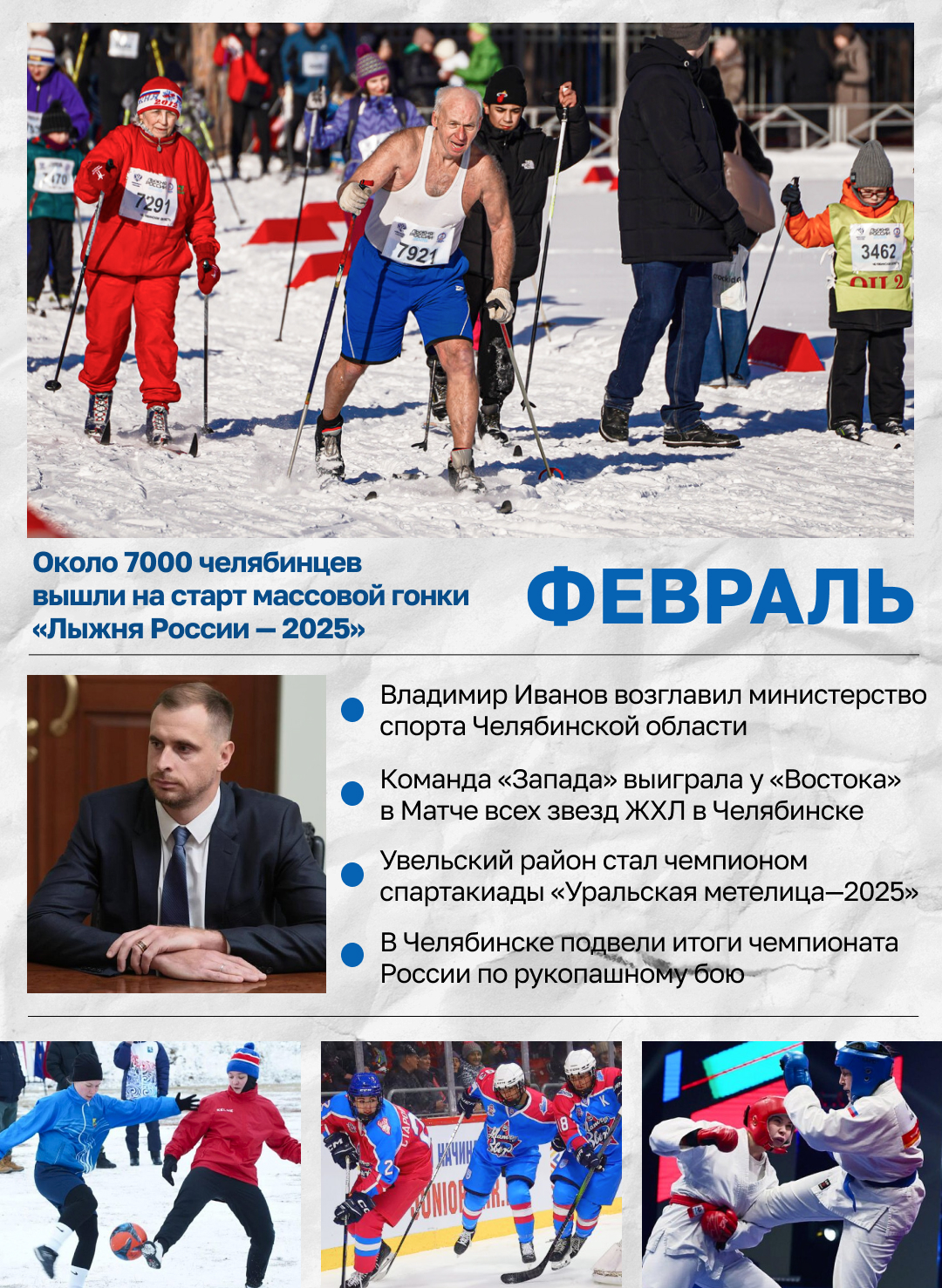 Февраль: около 7000 челябинцев вышли на старт «Лыжни России — 2025», а в регионе массовые состязания собрали более 19 тысяч любителей активного отдыха и здорового образа жизни