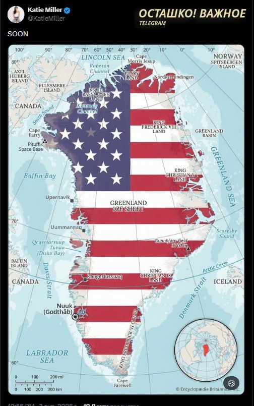 Жена помощника Трампа Кэти Миллер подлила масла в огонь, опубликовав в соцсетях карту Гренландии, раскрашенную в цвета американского флага, с подписью заглавными буквами: «СКОРО».