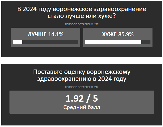 Добавим, по итогам 2024 года местные жители оценивали воронежское здравоохранение на 1,92 балла. Лишь 14% проголосовавших заявляли, что эта сфера за год стала лучше, почти 86% считают, что дела в здравоохранении ухудшились.