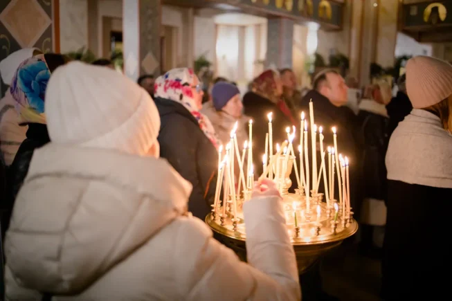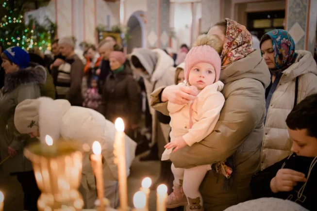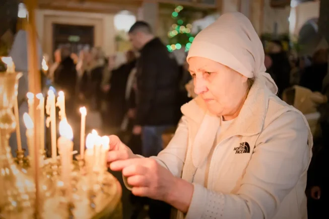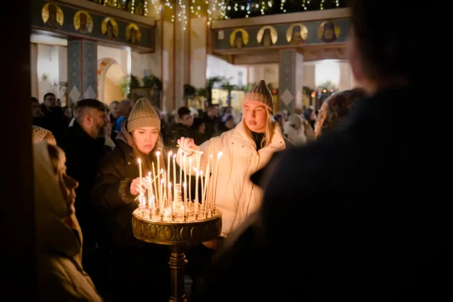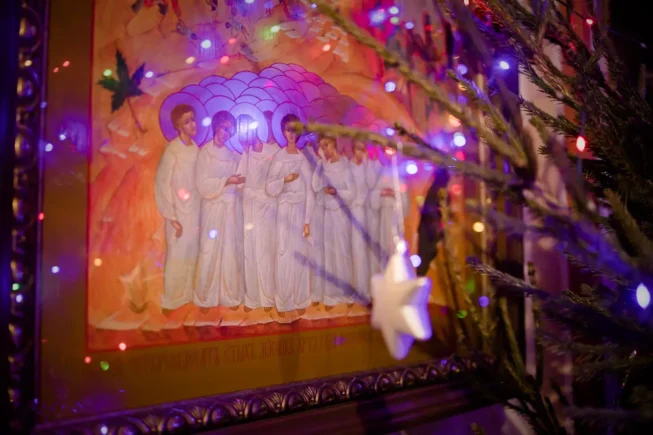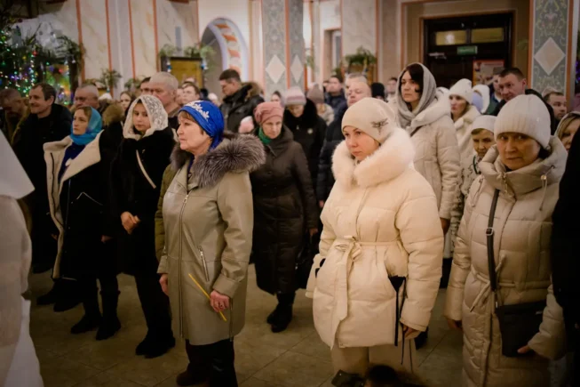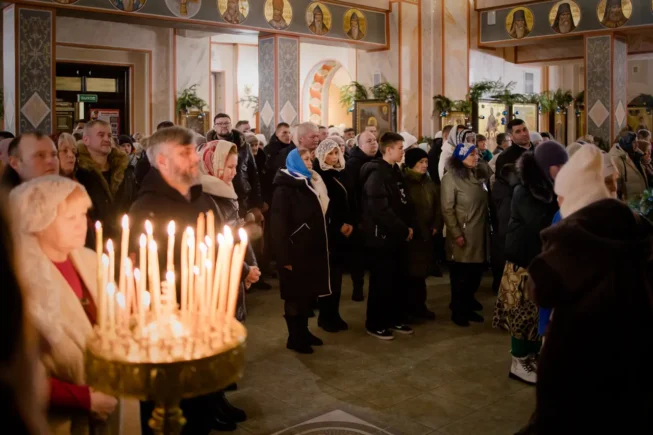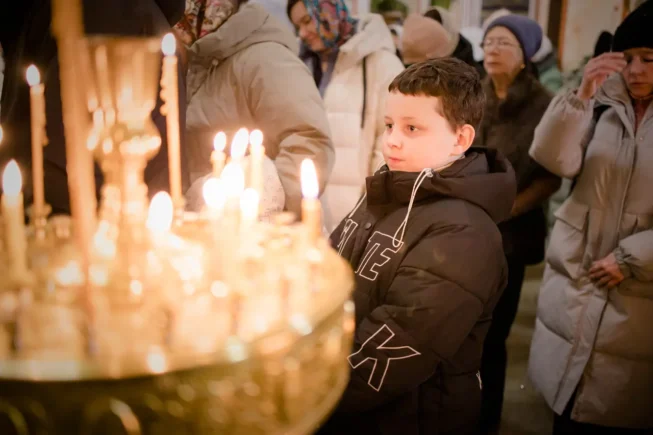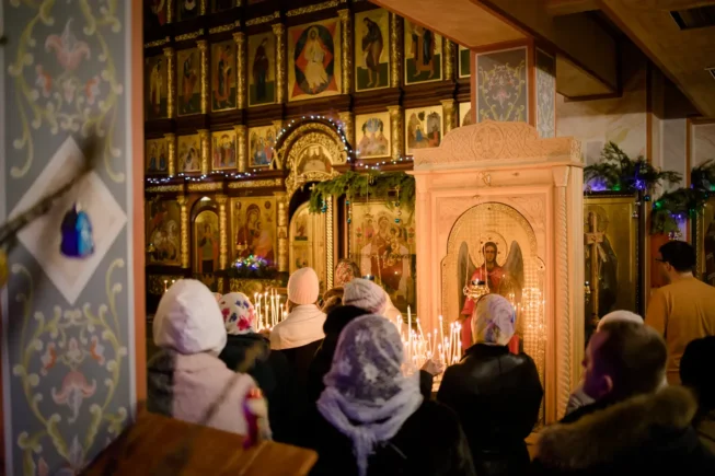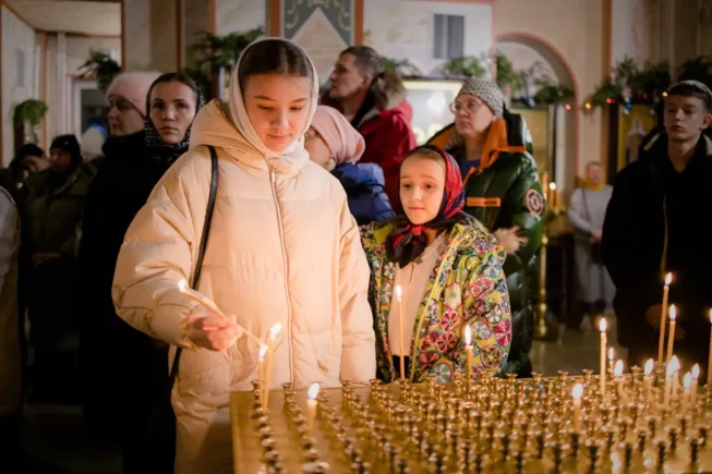 Наш фоторепортаж — из храма Архистратига Михаила, где праздничную атмосферу создавали украшенный вертеп с гирляндами и еловыми ветками, а также нарядная рождественская елка внутри. Несмотря на морозную и ветреную ночь, десятки горожан пришли помолиться и разделить радость великого праздника.