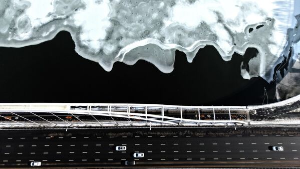 Аэрофотоснимок реки Хуньхэ, покрытой тонким слоем льда после сильного снегопада в городе Шэньян, провинция Ляонин, Китай.