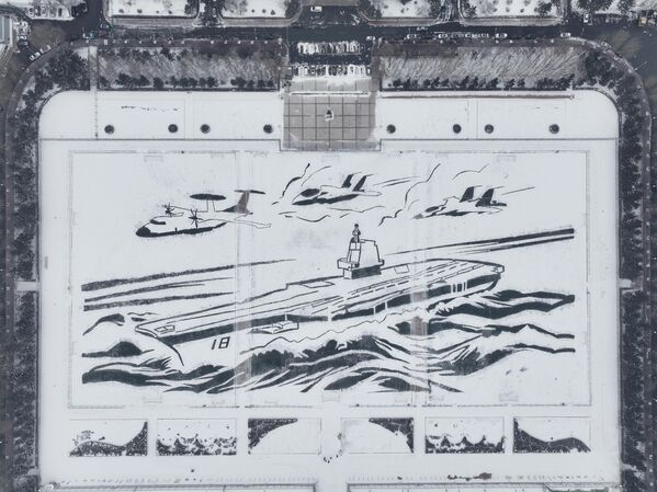 Вид с высоты птичьего полета на гигантский авианосец на заснеженной спортивной площадке Харбинского инженерного университета, Китай.