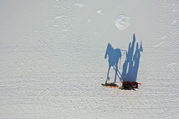 Дрон снял с высоты туристов во время прогулки на санях, запряженных лошадьми, по покрытому льдом озеру Чилдыр в провинции Ардахан, Турция.