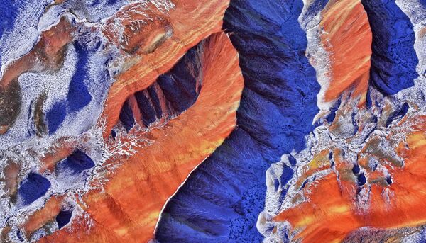 Живописный район Цицай Данся, покрытый снегом, в Чжанъе, провинция Ганьсу, Китай, снятый с высоты.