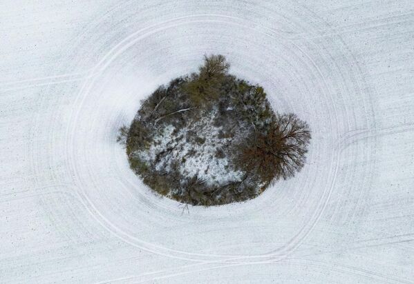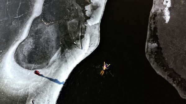 На аэрофотоснимке, сделанном в Шэньяне, провинция Ляонин, Китай, любитель зимнего плавания купается в ледяных водах реки, несмотря на сильный холод.