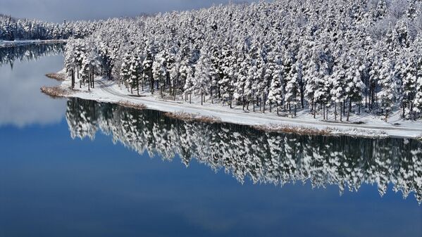 Аэрофотоснимок заснеженного плато Топук, расположенного на высоте 1280 метров, после снегопада в районе Кайнасли города Дуздже, Турция.