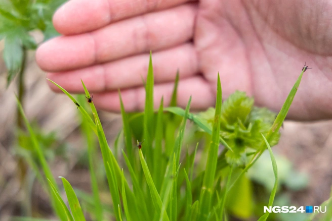 Вот столько клещей мы видели на Столбах. На самом деле их было больше. Но тут, прямо скажем, густонаселенный пучок травы. Не советуем их кормить.