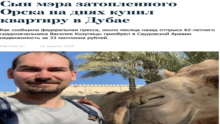 Вспомним Орск весной 2024-го: город тонул после прорыва дамбы, а сын мэра Василия Козупицы нежился в 90-метровых апартаментах Дубая за более чем 30 млн рублей. Когда земляки взбунтовались, он сетовал на жару – "там далеко не мёд". Итог: отца отправили в отставку.