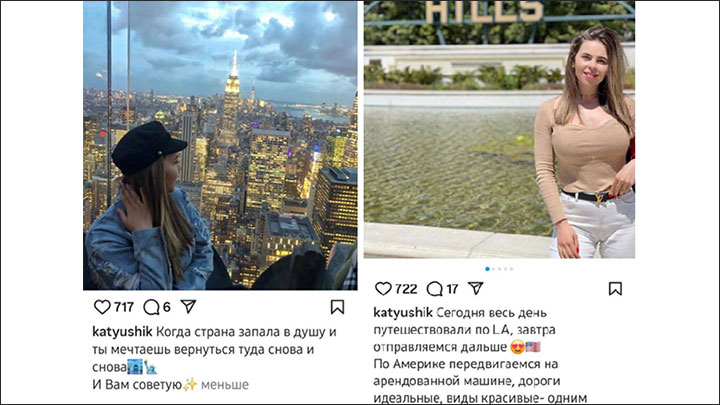 Соцсети Екатерины кишат роскошью: перелёты в Дубай и на Мальдивы, "гелики" с Mercedes S-класса, брендовые шмотки. В разгар СВО в 2023-м она хвасталась шампанским Moët за 80 тысяч рублей и сумкой Louis Vuitton за 225 тысяч для собаки. Поездки в США были в 2018 и 2024 годах, но после резонанса в сети девушка закрыла свои аккаунты.