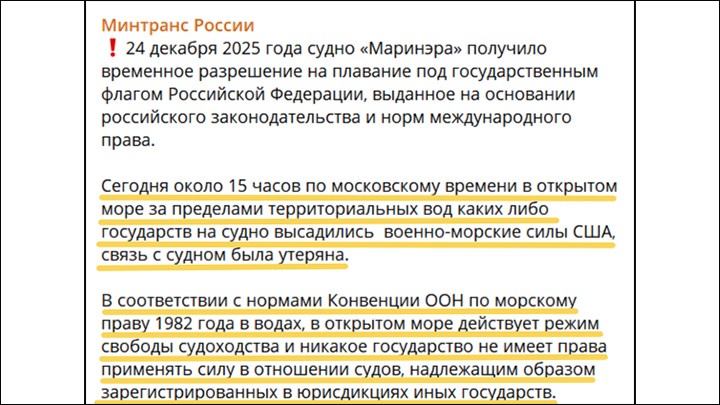 В 17:48 пресс-служба Министерства транспорта РФ подтвердила факт захвата: "24 декабря 2025 года судно «Маринэра» получило временное разрешение на плавание под государственным флагом Российской Федерации, выданное на основании российского законодательства и норм международного права. Сегодня около 15 часов по московскому времени в открытом море за пределами территориальных вод каких-либо государств на судно высадились военно-морские силы США, связь с судном была утеряна. В соответствии с нормами Конвенции ООН по морскому праву 1982 года в водах, в открытом море действует режим свободы судоходства и никакое государство не имеет права применять силу в отношении судов, надлежащим образом зарегистрированных в юрисдикциях иных государств".