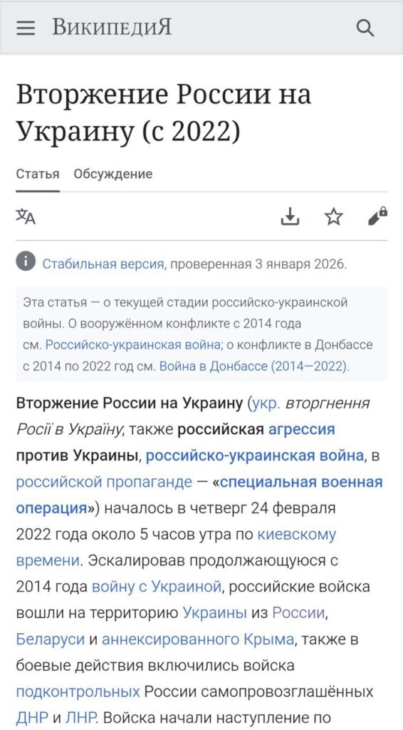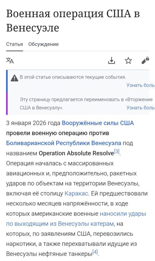 В русской “Википедии” статьи разняться диаметрально в подаче информации. СВО России на Украине называют “вторжением”, а операцию США в Венесуэле – “военной операцией США”.