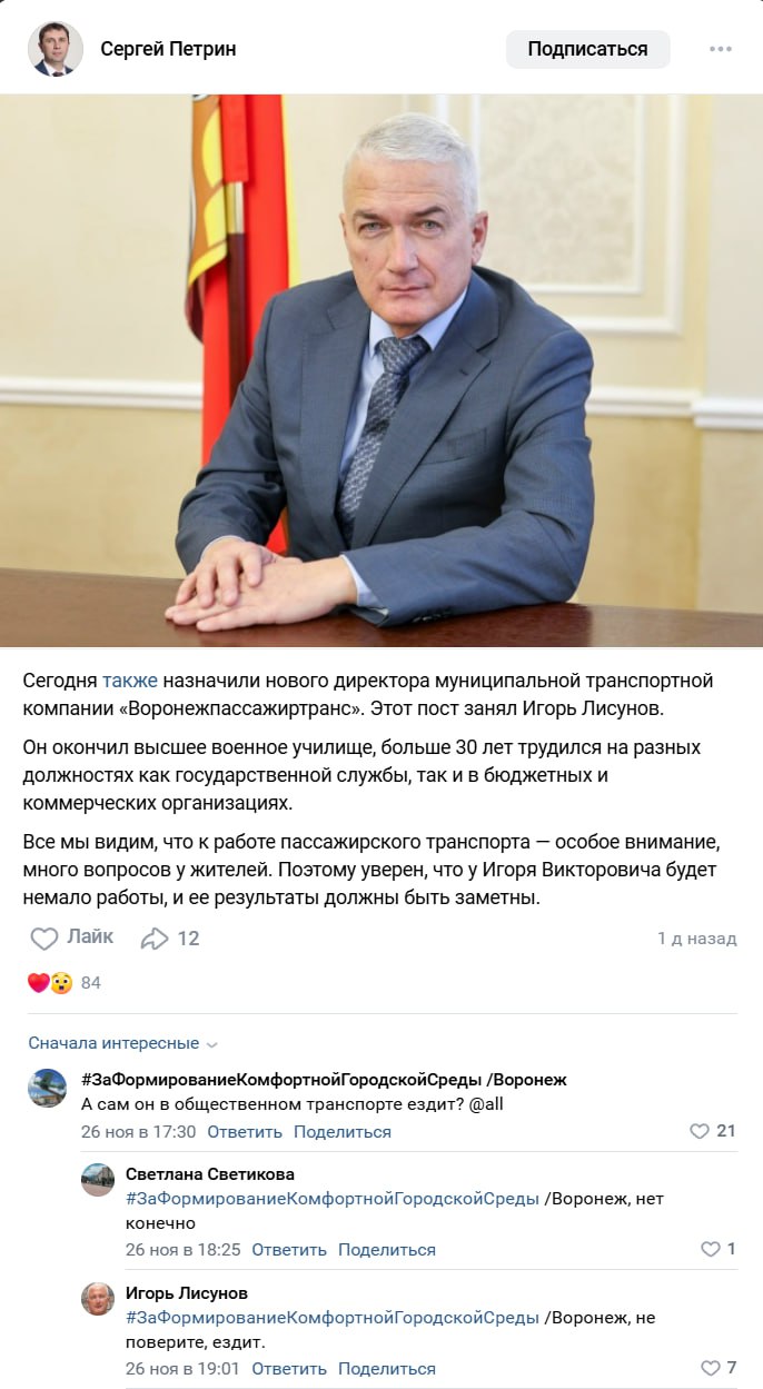Однако есть ли в этом большая заслуга городской администрации, сказать трудно. Перевозчик региональный, а деньги на закупку автобусов были выделены из областного бюджета после «пинка» в Совете Федерации. Есть ощущения положительных изменений и в городском перевозчике «Воронежпассажиртранс». Пока они вызваны только кадровыми решениями. После никак не проявивших себя на посту руководителей организации Олега Миронова и Романа Аржаных должность занял Игорь Лисунов. Почти сразу же он отметился своей готовностью коммуницировать с населением. В комментариях к посту Петрина о своем назначении он, общаясь с воронежцами, рассказал, что сам ездит на автобусе. Правда, поверили Лисунову не все пользователи.