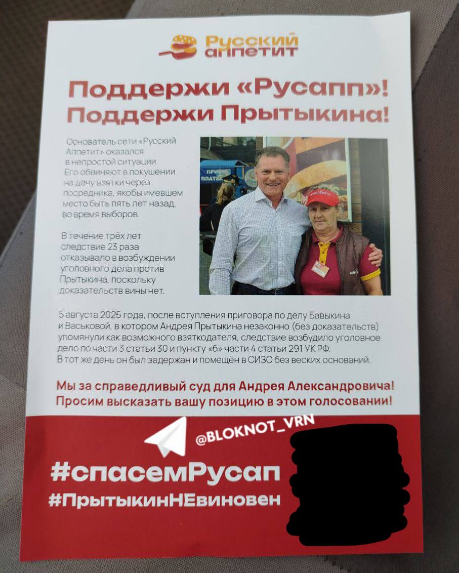 Отметим, что Андрей Александрович пытается вновь очутиться на свободе, прибегая не только к сугубо правовым методам. Так, в октябре 2025 года жители Воронежа начали присылать в редакцию «Блокнота» фото листовок, которые теперь можно получить в ларьках «Русского Аппетита» вместе с заказом, а иногда и вовсе без него. На бумажке размещена фотография улыбающегося владельца сети фастфуда и экс-депутата облдумы Андрея Прытыкина, обнимающего облаченную в униформу продавщицу.