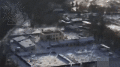 Далее идёт два видео. На одном из них ВСУ сбрасывают с дрона флаг на магнитиках на крышу местной администрации. На втором бойцы 68-й мсд подрывают с помощью FPV флаг вместе со стойкой. Снайперская пара 121-го мотострелкового полка 6-й гвардейской армии уничтожает стрелковым оружием возвращающийся к ПУ БПЛА коптер: