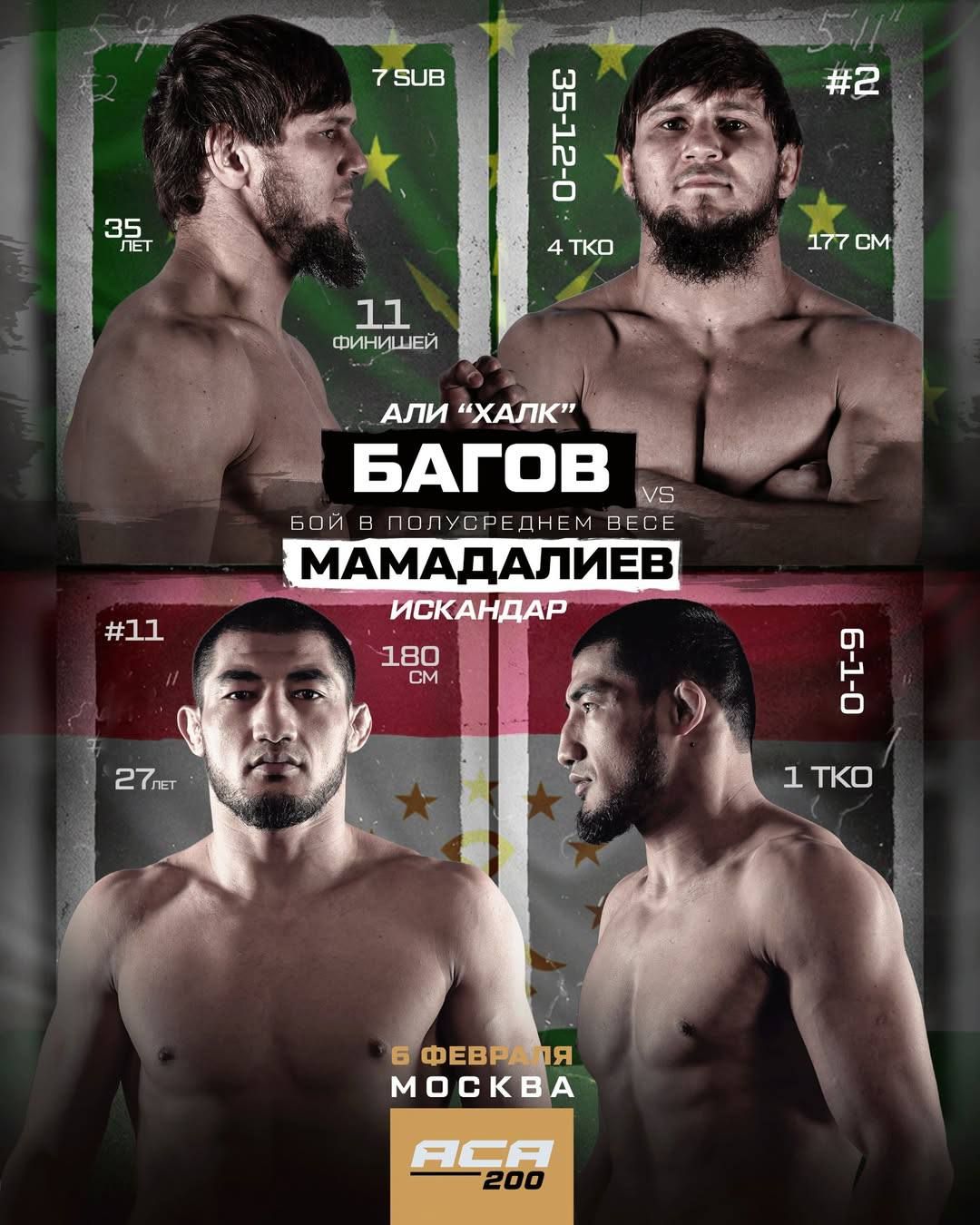 Боец ММА Искандар Мамадалиев выйдет на замену Эдуарду Вартаняну в бою с Али Баговым, который состоится 6 февраля в Москве и возглавит турнире ACA 200. Поединок пройдёт в лимите полусреднего дивизиона.