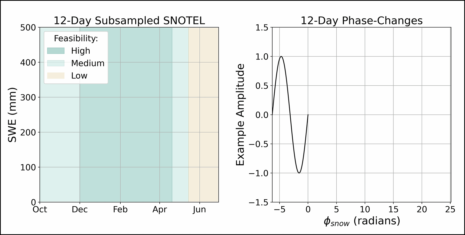 Рис. 2. Накопление запасов снежной воды (SWE) измерялось в течение водного 2024 года на станции SNOTEL (телеметрия снега) Гризли-Пик в Колорадо (слева). Запасы SWE были разделены на 12-дневные интервалы, чтобы проиллюстрировать, как может выглядеть кривая накопления SWE, полученная с помощью NISAR. Цвета фона представляют собой исследованную осуществимость метода InSAR в L-диапазоне в течение всего снежного сезона. Наибольшая осуществимость ожидается с декабря по середину апреля, когда снежный покров, вероятно, сухой. Меньшая осуществимость - в более тёплые месяцы, когда жидкая вода в более влажном снежном покрове поглощает энергию радиолокационного сигнала. При измерении с помощью InSAR события накопления или абляции снега вызывают фазовые изменения (т.е. изменения длины пути сигнала или времени распространения) в обнаруженных сигналах. График справа представляет собой идеализированный и упрощенный пример того, как могут выглядеть эти фазовые изменения (φsnow) на основе накопления и абляции SWE, показанных слева.
