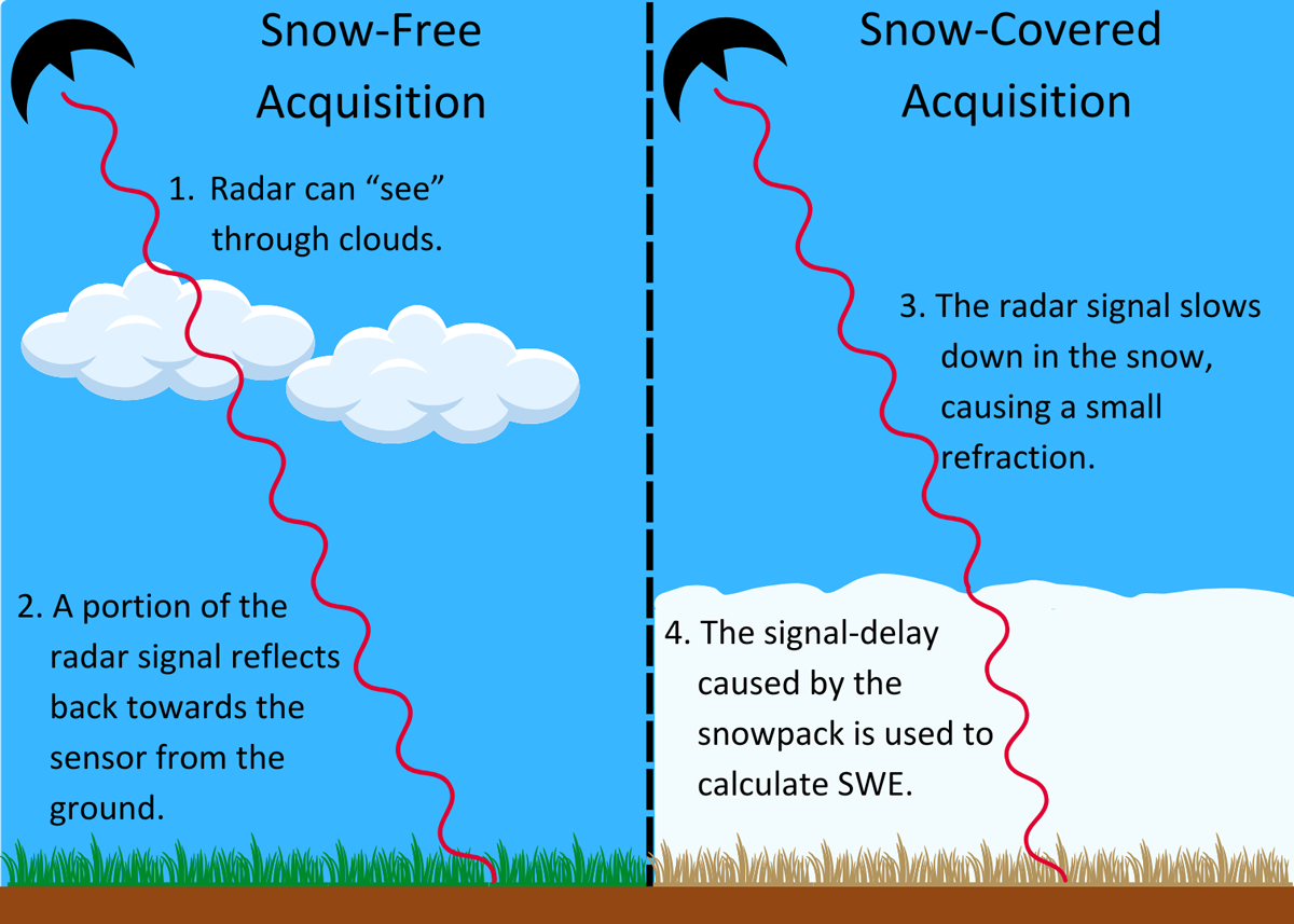 Многочисленные наземные и воздушные исследования за последние 50 лет показали, что глубину и массу снега можно рассчитать по времени распространения радиолокационных волн в снежном покрове. Радиолокационные сигналы охватывают микроволновую и радиоволновую части электромагнитного спектра и имеют гораздо большую длину волны, чем те, которые используются в оптической визуализации. Радиолокационные сигналы с длиной волны более 1 сантиметра проходят через сухой снежный покров, не содержащий талой воды, тогда как сигналы с длиной волны более 20 сантиметров могут проникать как в сухой, так и во влажный снежный покров [например, Bradford et al., 2009]. Однако ограничения пространственного разрешения и полосы пропускания препятствуют прямым измерениям времени распространения сигнала из космоса с использованием обычных радиолокационных систем.
