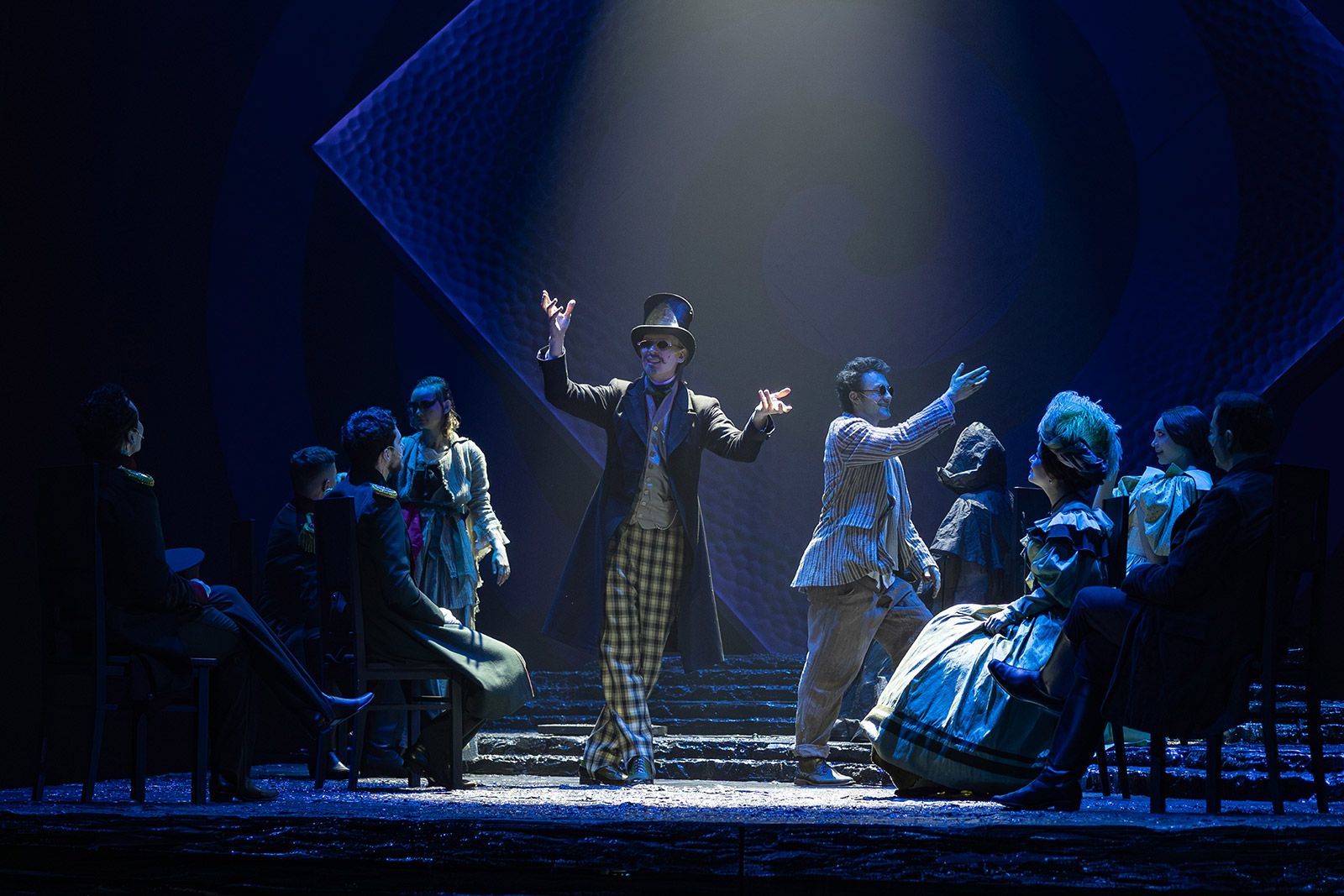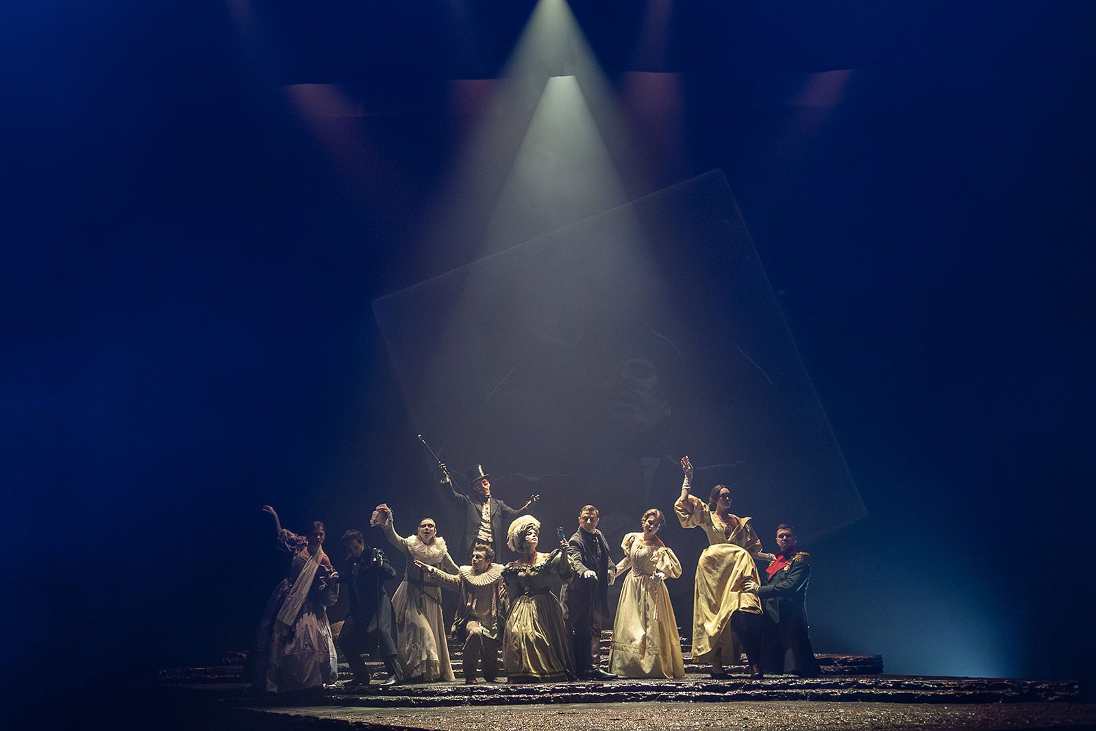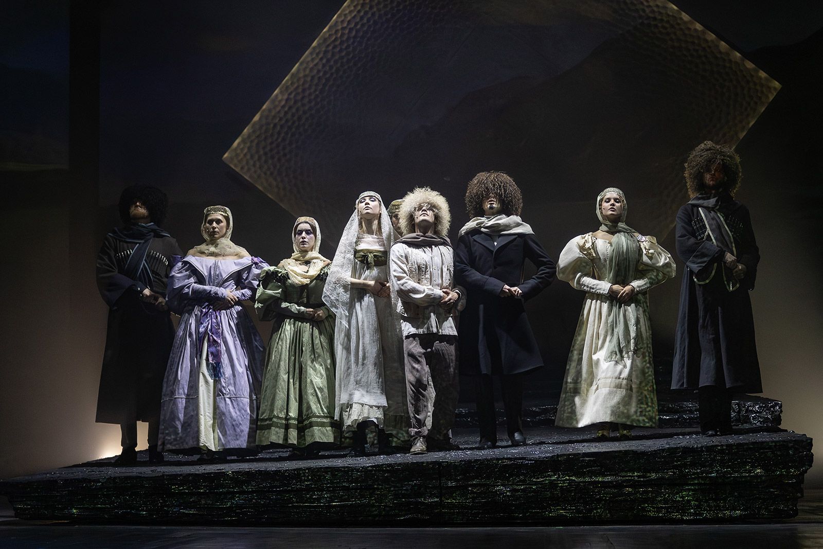 Пространство, в которое попадает поэт, не похоже ни на что. Мрачное и туманное, оно превращается то в побережье Тамани, то в горы Кавказа, то в улицы Пятигорска. Над декорацией в виде скального уступа, меняющего облик в зависимости от освещения, поработал заслуженный художник России Алексей Кондратьев.