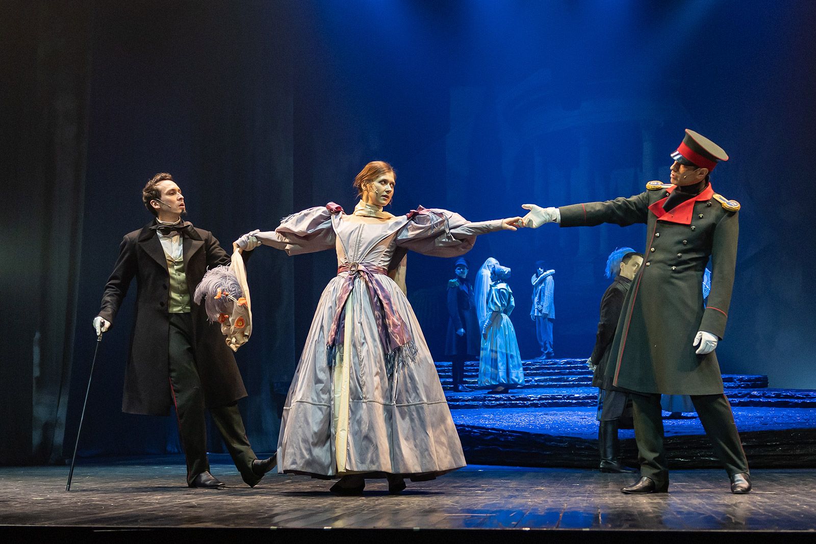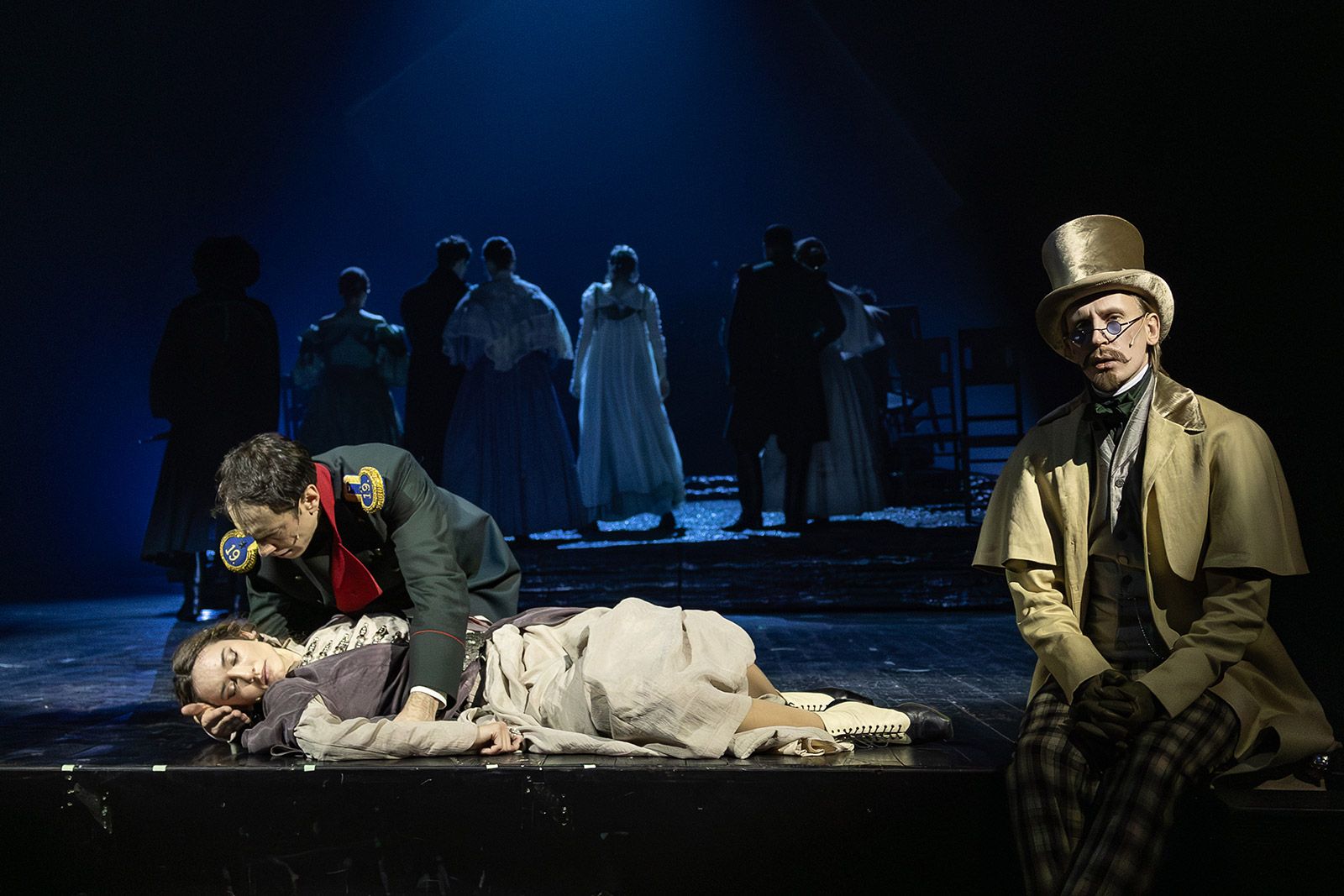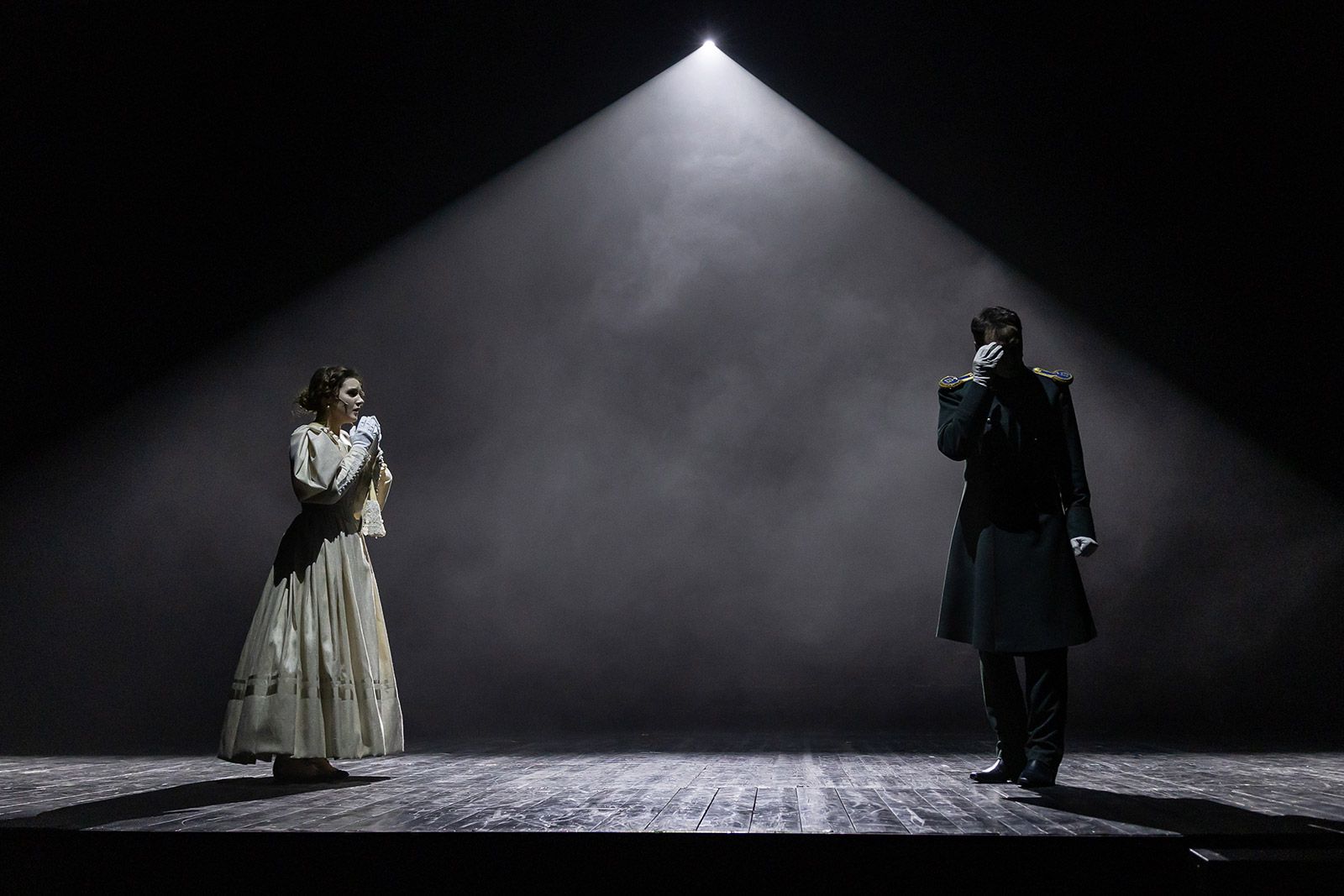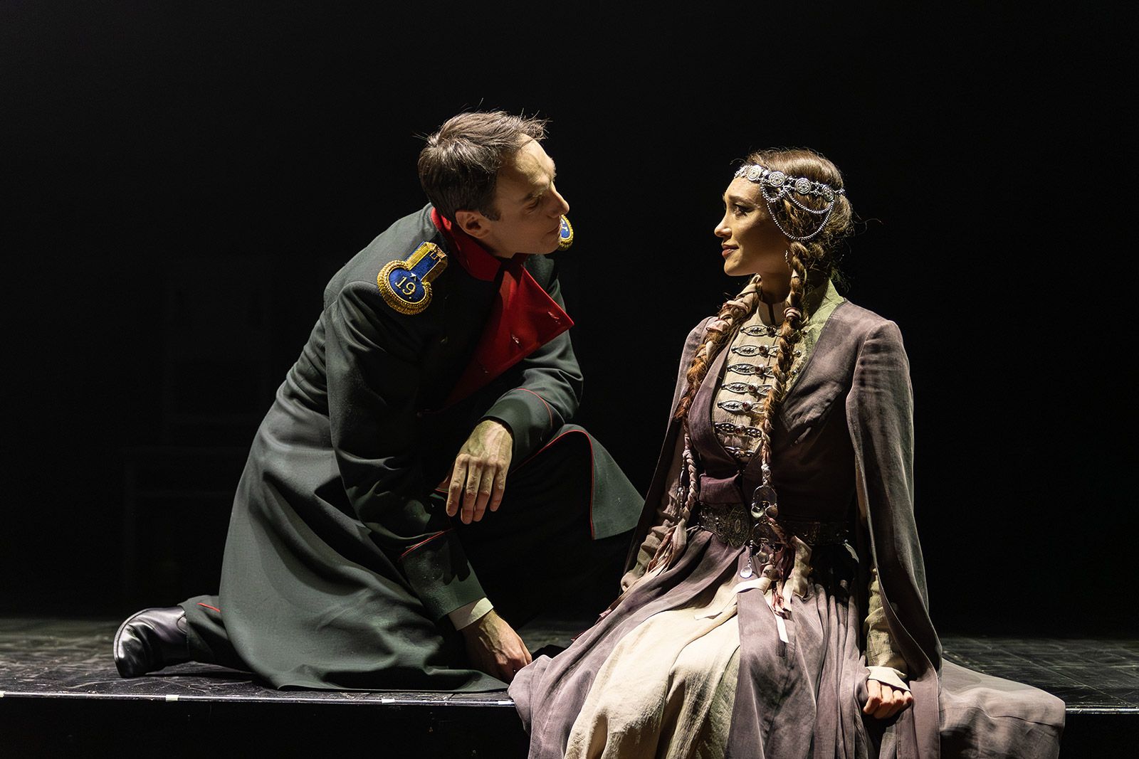 Например, он знакомится с Бэлой (Анастасия Епифанова), влюбляется в нее и, вопреки воле, покидает — так же, как это сделал тот, настоящий Печорин. Он понимает: обрекая девушку на гибель, он ломает жизнь и ее семье. Он спорит с собой и сюжетом, кричит от несправедливости, наблюдая со стороны, с какой тоской она танцует, с какой жестокостью ее убивает оскорбленный черкес Казбич. Встречи с княжной Мери и Верой, дуэль с Грушницким тоже становятся испытаниями.