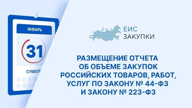 Не позднее 31 января 2026 года заказчики по Закону № 44-ФЗ и Закону № 223-ФЗ обязаны разместить отчет об объеме закупок товаров российского происхождения, работ, услуг, соответственно выполняемых, оказываемых российскими гражданами, российскими юридическими лицами.
