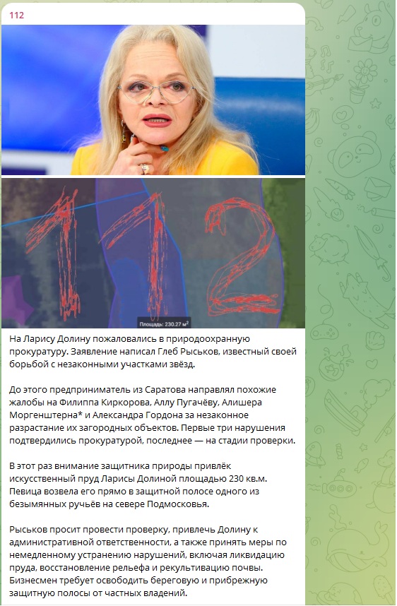 направлял похожие жалобы на Филиппа Киркорова, Аллу Пугачёву, Алишера Моргенштерна* и Александра Гордона за незаконное разрастание их загородных объектов,