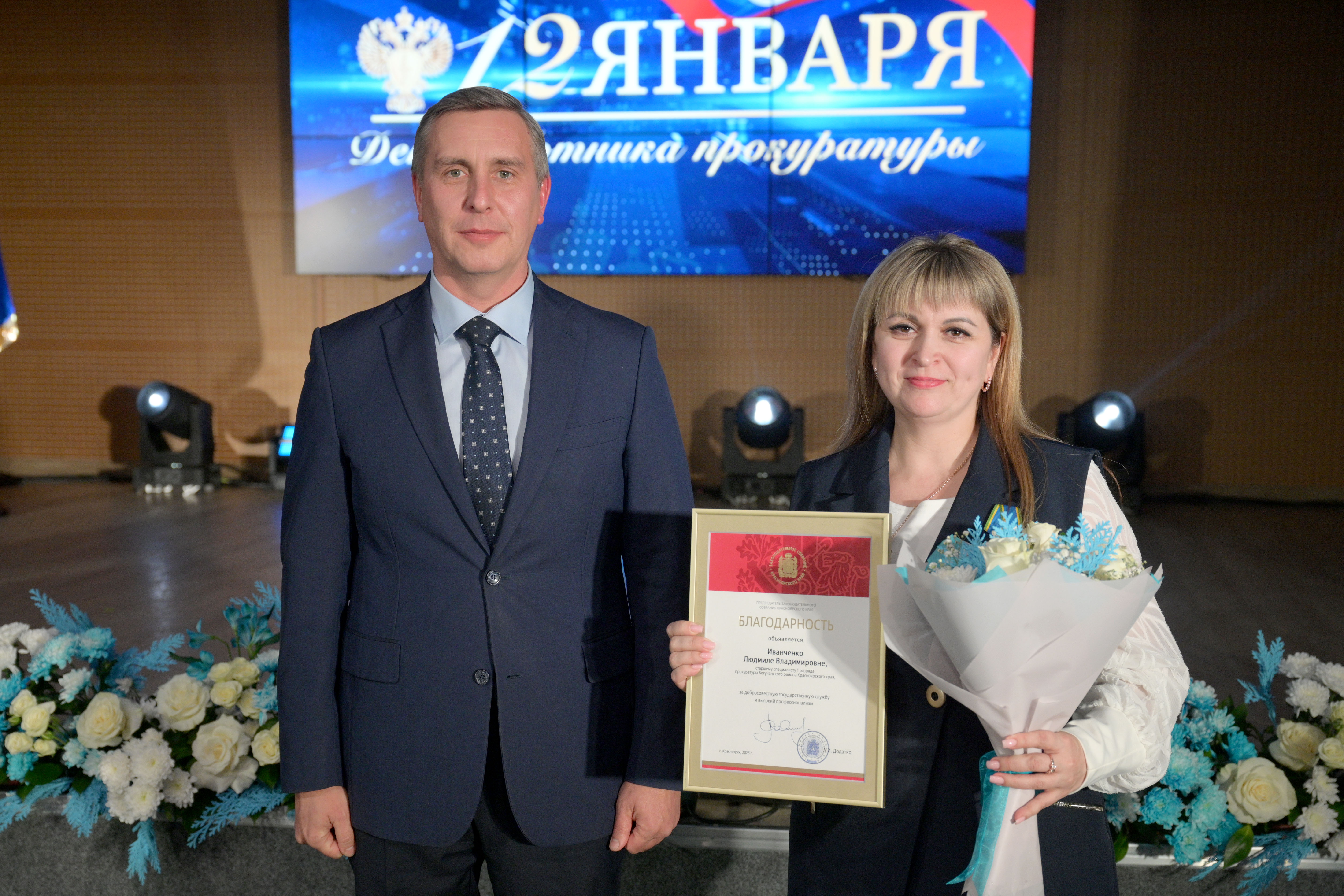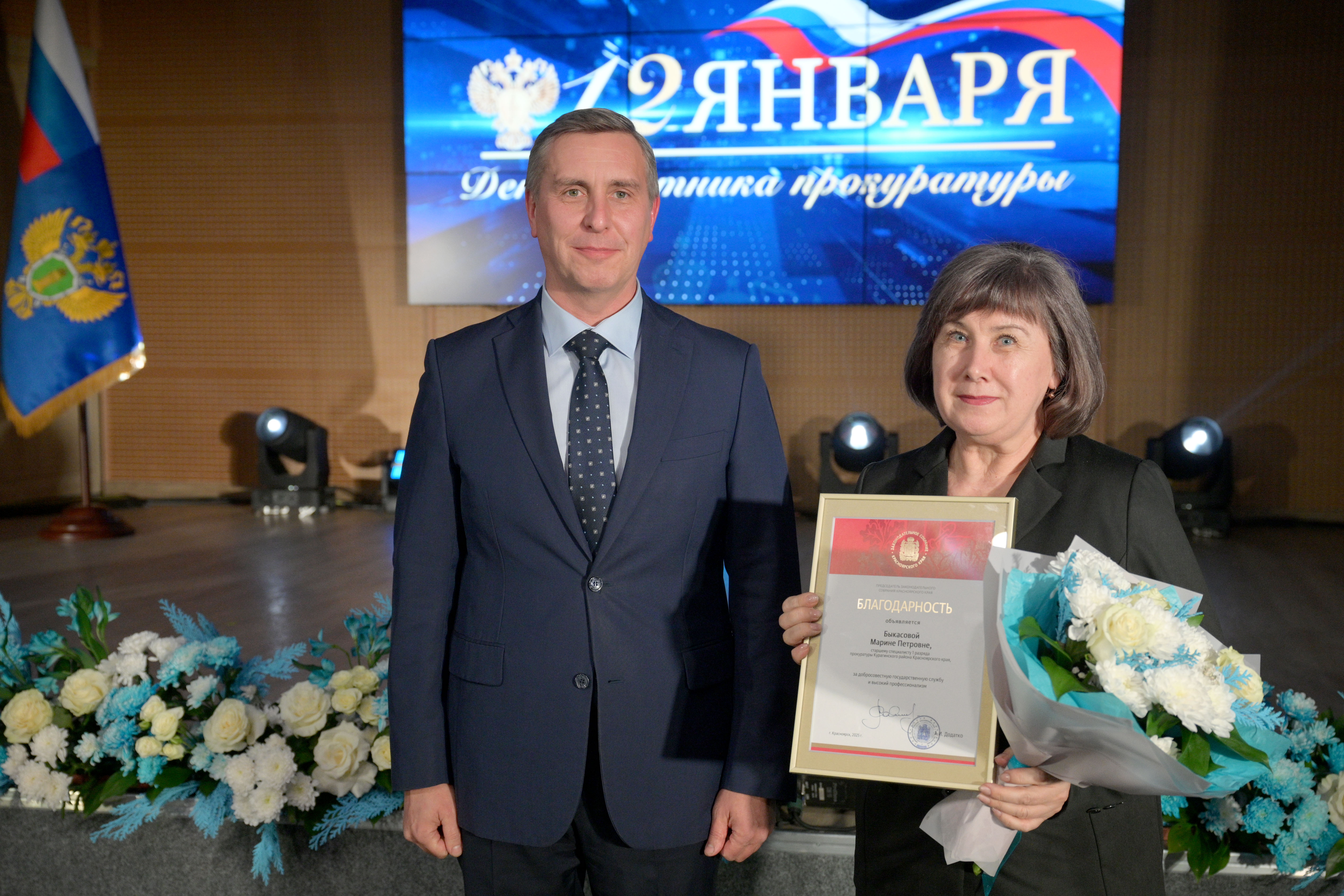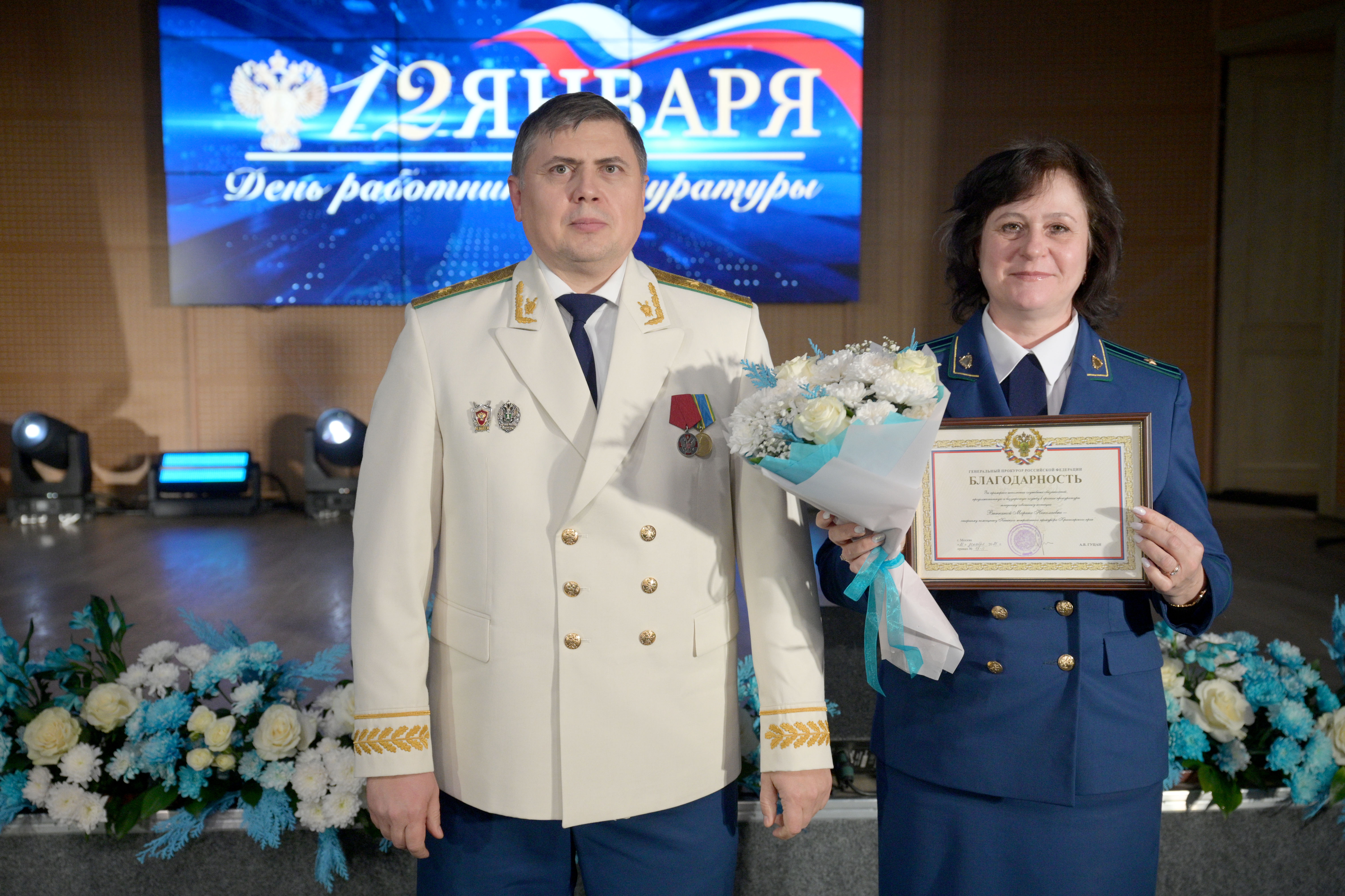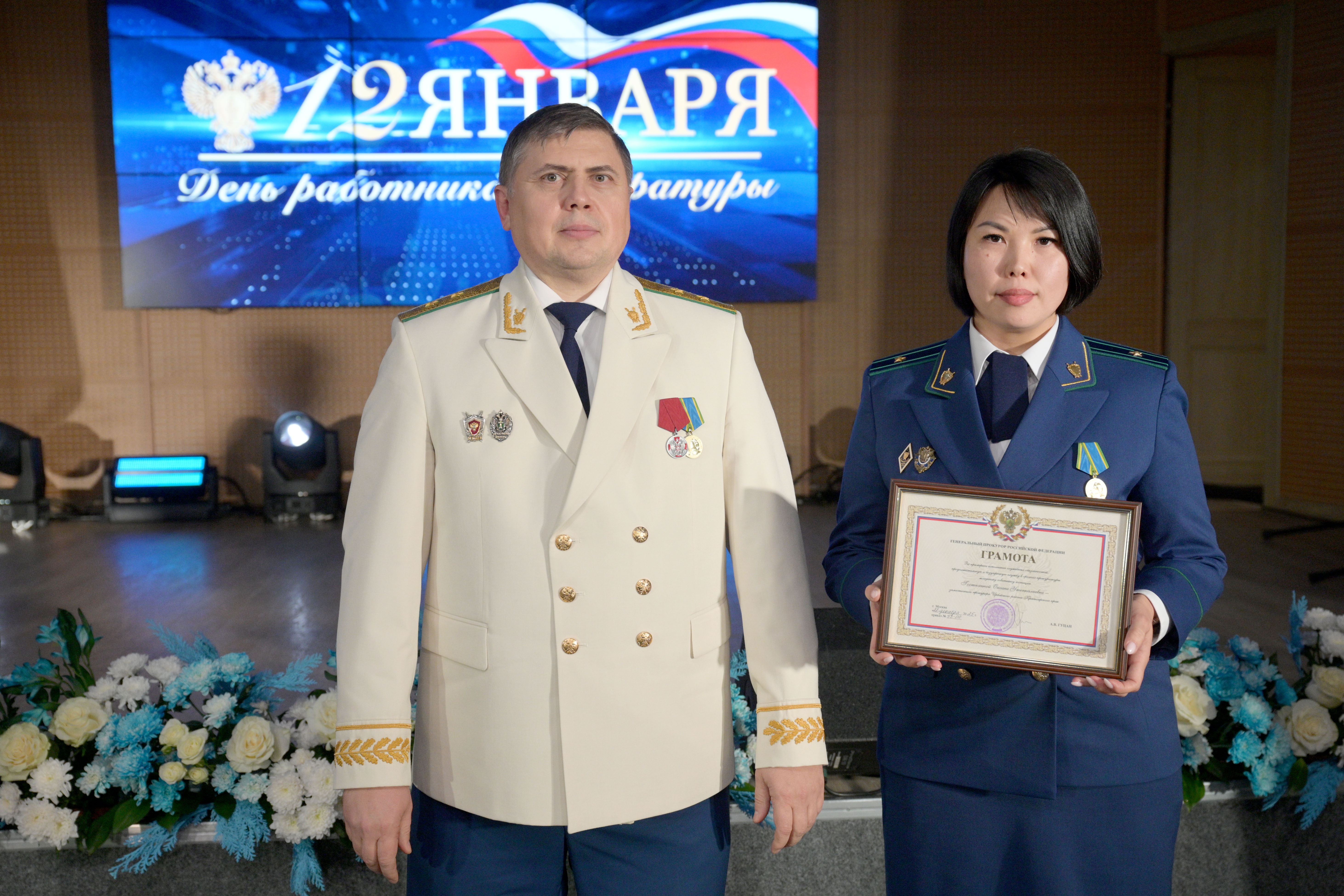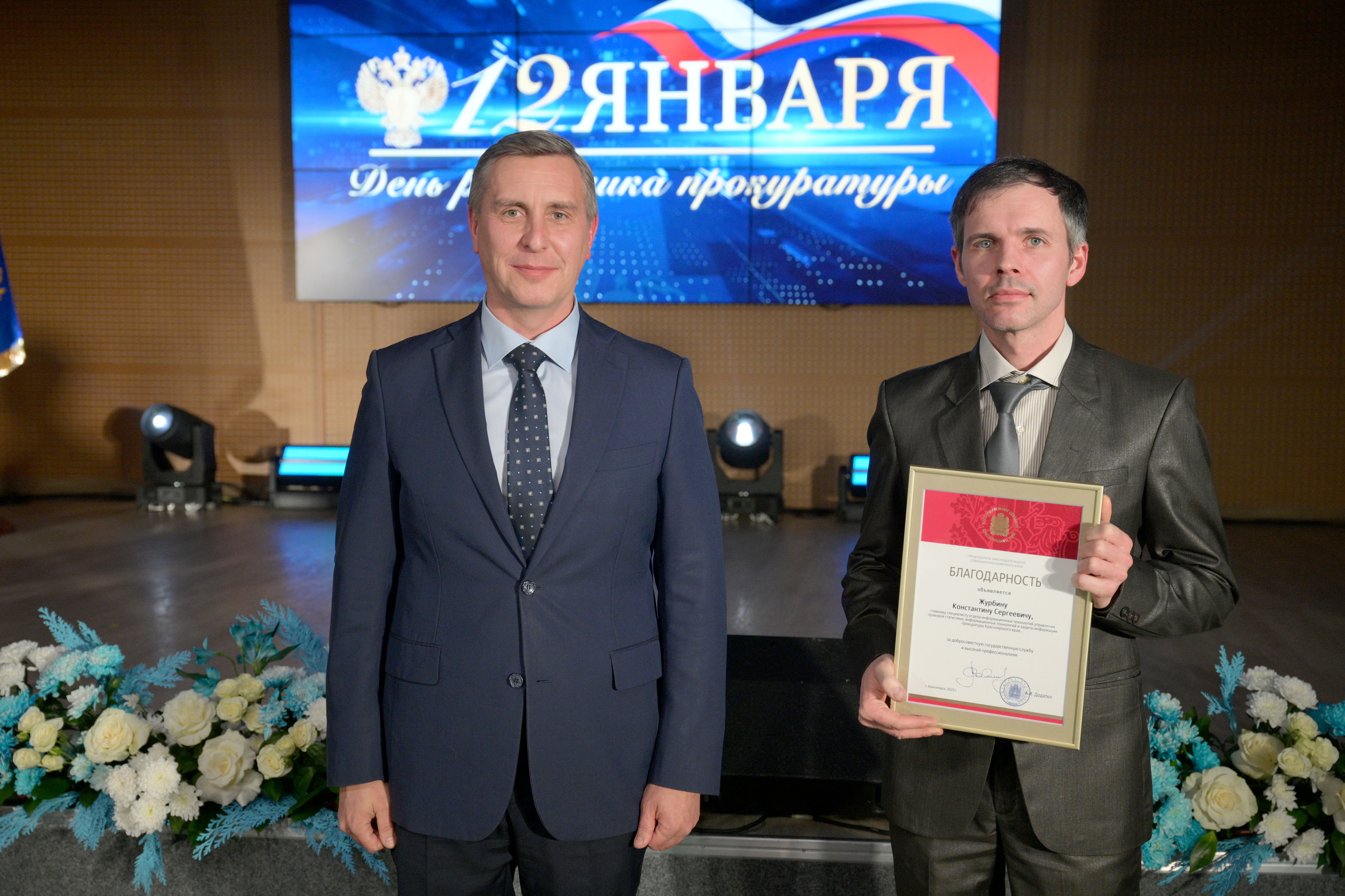 Мероприятие открыл прокурор Красноярского края Роман Тютюник. Он поздравил сотрудников и ветеранов прокуратуры с профессиональным праздником и поблагодарил за проделанную работу. В торжественной обстановке Роман Тютюник вручил награды Генерального прокурора России 33 сотрудникам и ветеранам за примерное исполнение служебных обязанностей, заслуги в деле укрепления законности и правопорядка. Отличившиеся работники также поощрены Губернатором края, председателем Законодательного Собрания края. Прокурор края вручил благодарственные письма родителям прокурорских работников за достойное воспитание сыновей и дочерей.