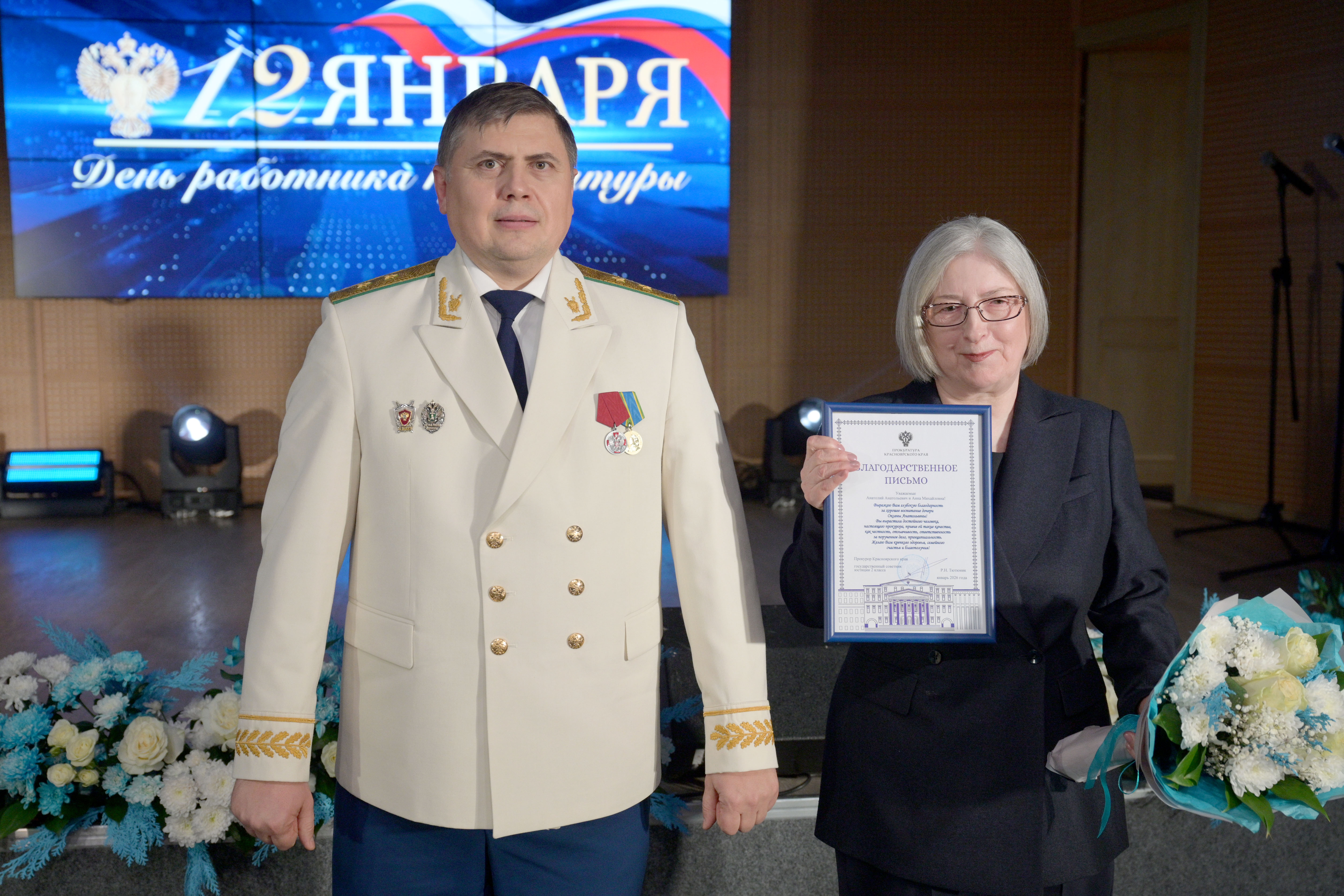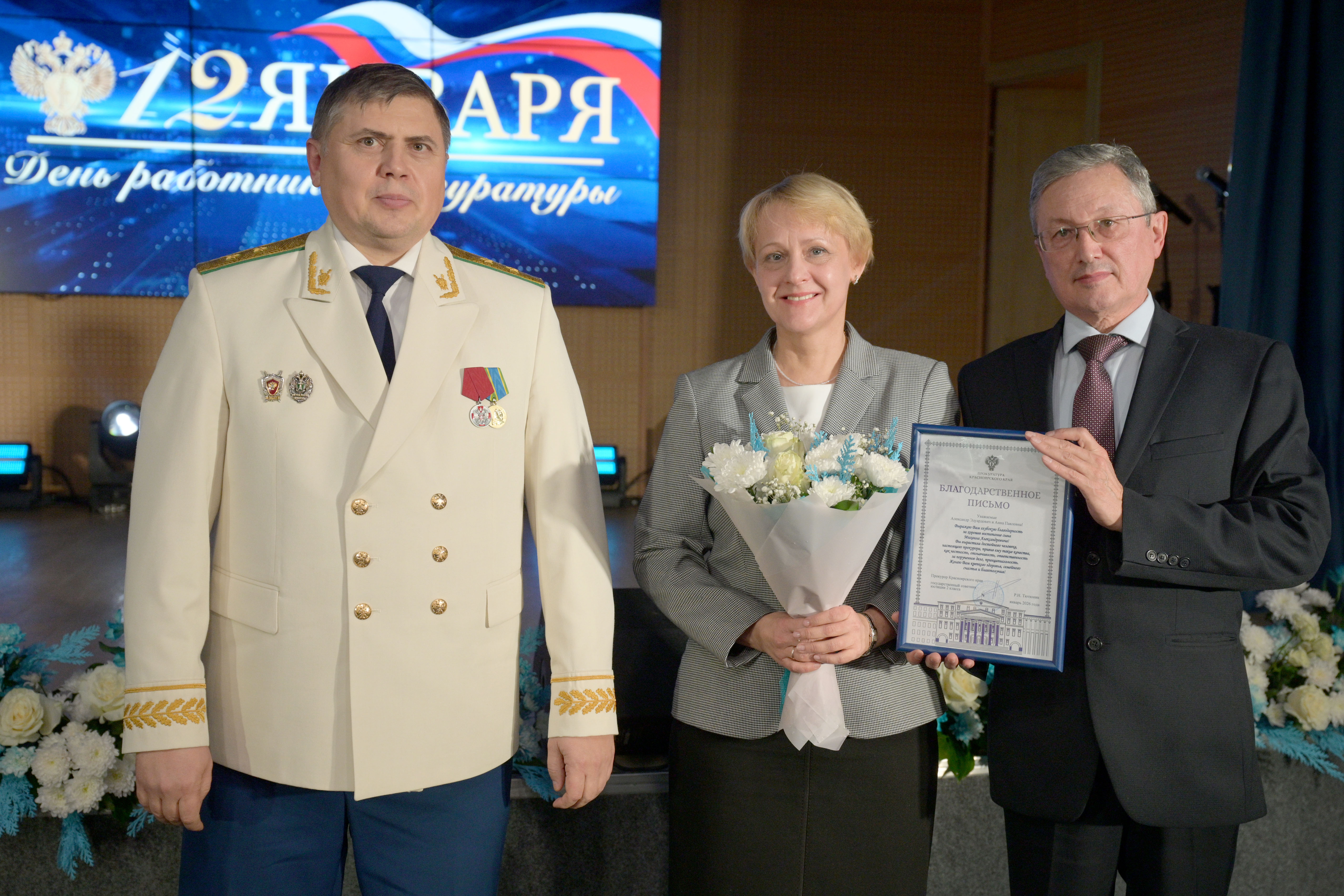 Коллектив прокуратуры Красноярского края выражает признательность за достойное воспитание высококвалифицированных специалистов маме заместителя от-дела обеспечения участия в гражданском и арбитражном процессе Михаила Федорченко— Наталии Владимировне, папе и маме прокурора Ермаковского района Михаила Островского — Александру Эдуардовичу и Анне Павловне, папе и маме старшего прокурора отдела по надзору за исполнением законов о федеральной безопасности, межнациональных отношениях, противодействии экстремизму и терроризму Оксаны Грищук — Анатолию Анатольевичу и Анне Михайловне.