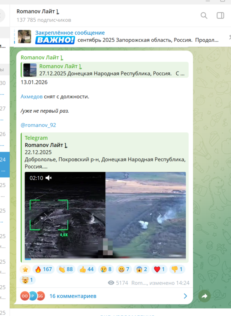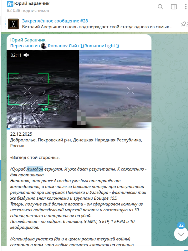 Заместитель главнокомандующего военно-морским флотом по береговым и сухопутным войскам Ахмедов Сухраб Султанович снят с должности. В том числе и за безграмотно организованное 22 декабря 2025 года наступление колонной на Доброполье, повлёкшее собой неоправданные и безрезультативные потери.