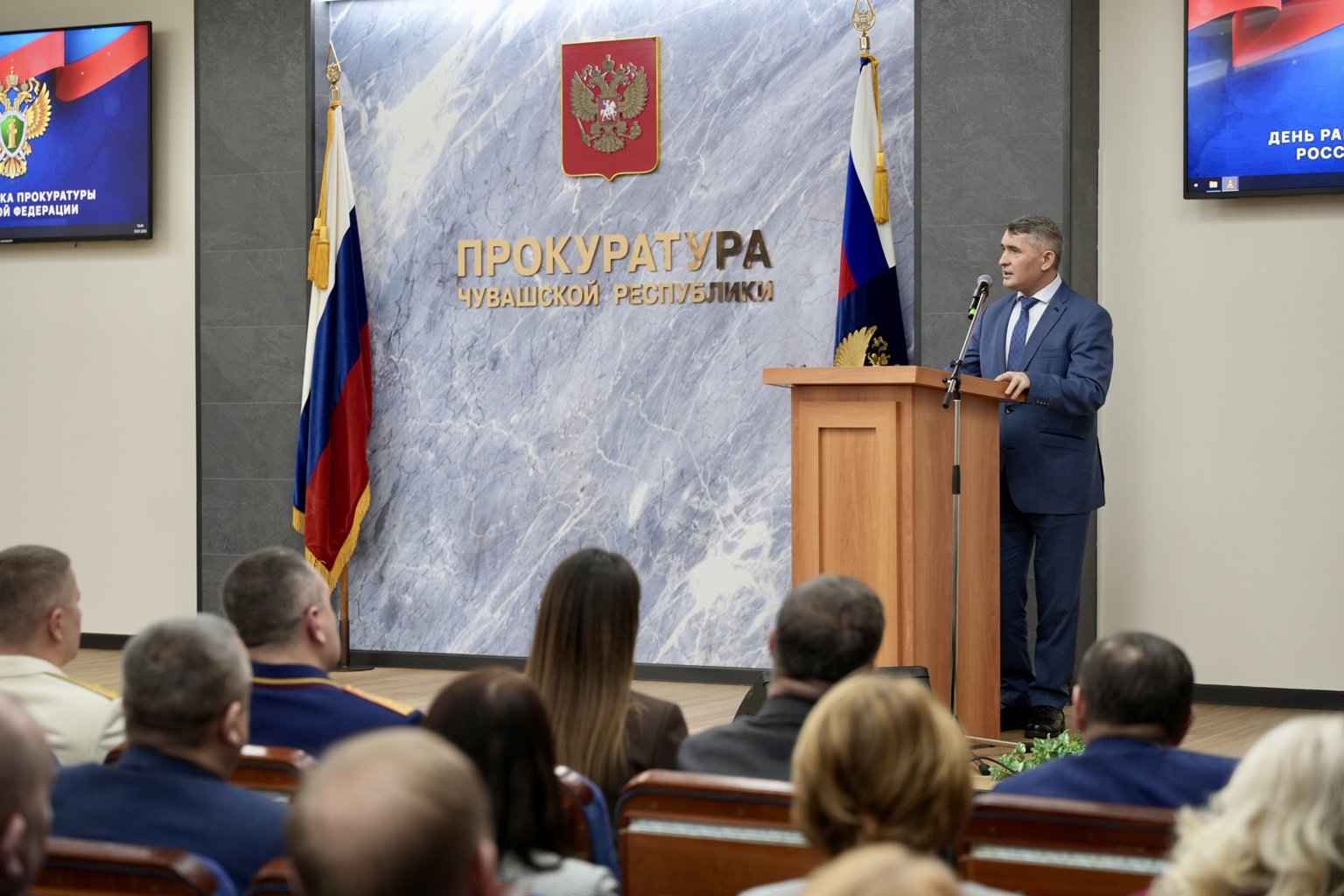Эдуард Гиматов, прокурор Чувашской Республики:От всей души поздравляю всех сотрудников и ветеранов прокуратуры Чувашской Республики с нашим профессиональным праздником. Коллеги, в прошедшем году, как и в предыдущие годы всем нам пришлось трудиться в непростых условиях. Трудовой коллектив прокуратуры республики ответственно выполнял поставленные президентом России и генеральным прокурором задачи по обеспечению законности, правопорядка и безопасности нашей страны. Старались все и опытные сотрудники, и молодые специалисты. Ведь каждый понимает, что прокурорская служба требует максимальной оперативности, высокого уровня профессионализма и большой самоотдачи.