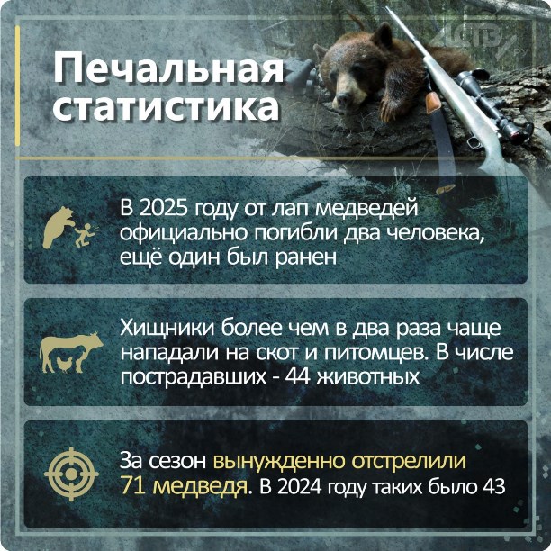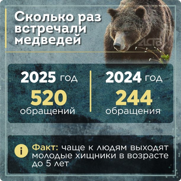 Ежегодно фиксируют и случаи нападения медведей на скот и домашних животных. Так, по итогам сезона-2025 официально пострадавшими числятся 44 животных. Статистика более чем в два раза превысила показатели 2024 года. Рост составил 110%.